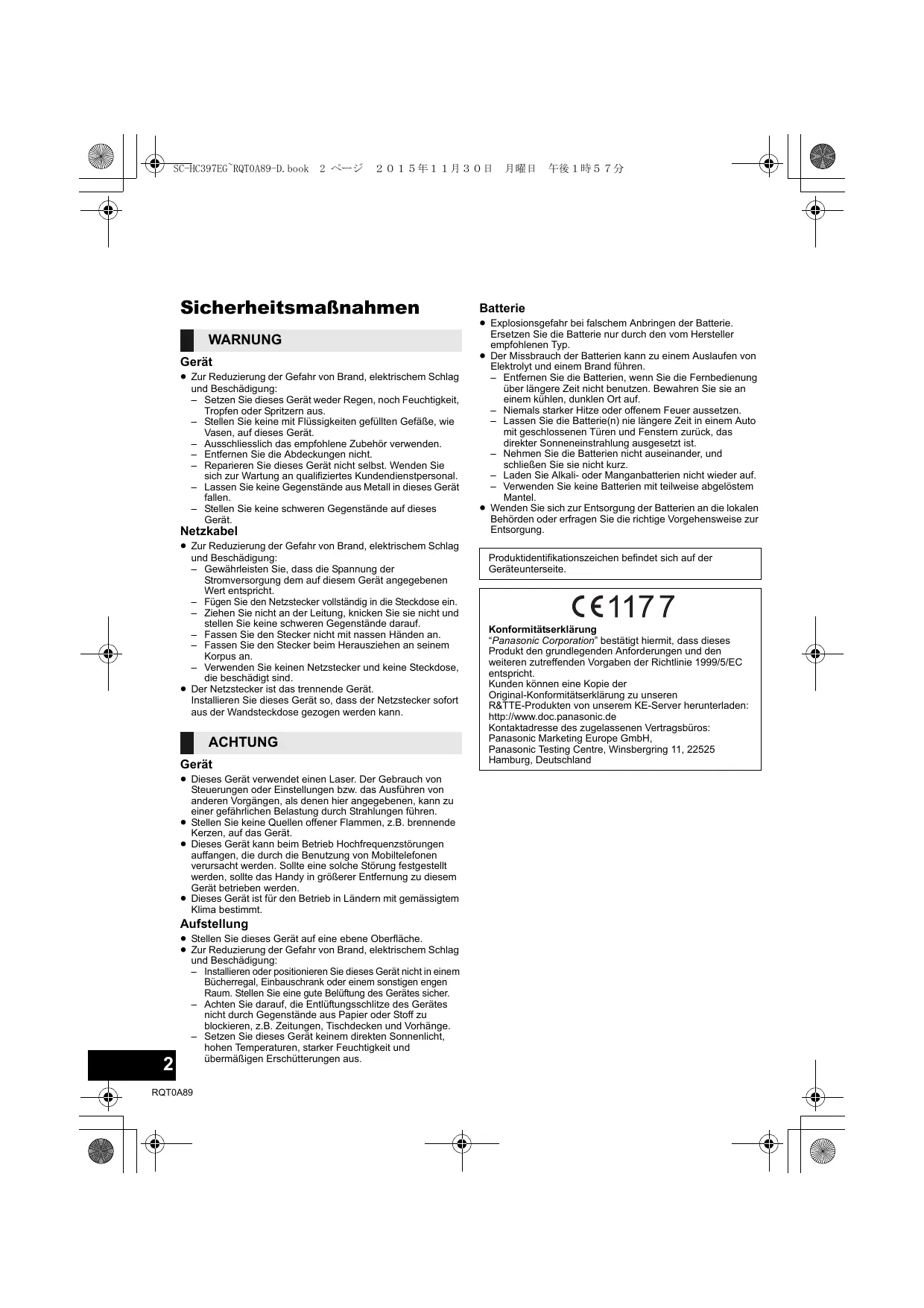 "Panasonic Corporation" bestätigt hiermit, dass diese Produkt den grundlegenden Anforderungen und den weiteren zuteffenden Vorgaben der Richtlinie 1999/5/EC entspricht.