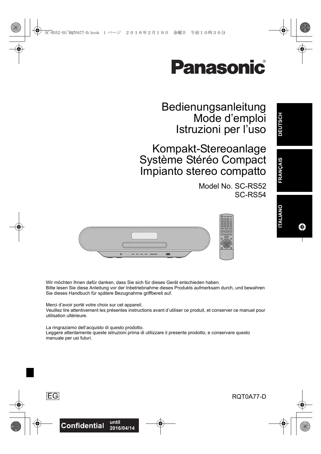 FRANÇAIS SC-RS52-EG~RQT0A77-D.book 1 ページ 2016年2月19日 Wir möchten Ihnen dafür danken, dass Sie sich für dieses Gerät entschieden haben. Bitte lesen Sie diese Anleitung vor der Inbetriebnahme dieses Produkts aufmerksam durch, und bewahren Sie dieses Handbuch für spätere Bezugnahme griffbereit auf. Merci d’avoir porté votre choix sur cet appareil. Veuillez lire attentivement les présentes instructions avant d’utiliser ce produit, et conserver ce manuel pour utilisation ultérieure. La ringraziamo dell’acquisto di questo prodotto. Leggere attentamente queste istruzioni prima di utilizzare il presente prodotto, e conservare questo manuale per usi futuri.