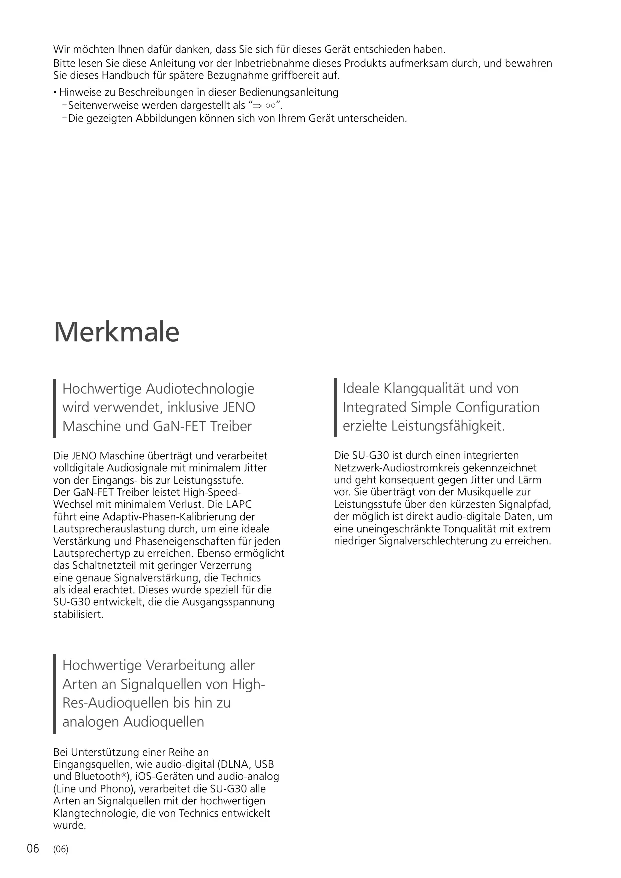 (06) Ideale Klangqualität und von Integrated Simple Configuration erzielte Leistungsfähigkeit. Die SU-G30 ist durch einen integrierten Netzwerk-Audiostromkreis gekennzeichnet und geht konsequent gegen Jitter und Lärm vor. Sie überträgt von der Musikquelle zur Leistungsstufe über den kürzesten Signalpfad, der möglich ist direkt audio-digitale Daten, um eine uneingeschränkte Tonqualität mit extrem niedriger Signalverschlechterung zu erreichen. Inhaltsverzeichnis Lesen Sie vor der Verwendung die “Sicherheitsvorkehrungen” in diesem Handbuch sorgfältig durch. Installation Installation