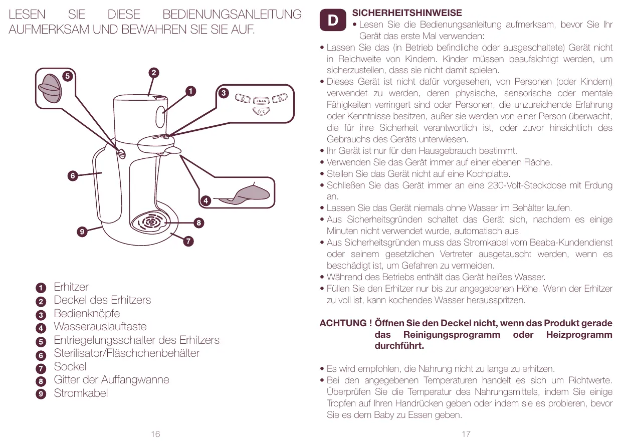 • Cet appareil n’est pas prévu pour être utilisé par des personnes (y compris les enfants) dont les capacités physiques, sensorielles ou mentales sont réduites, ou des personnes dénuées d’expérience ou de connaissance, sauf si elles ont pu bénéficier, par l’intermédiaire d’une personne responsable de leur sécurité, d’une surveillance ou d’instructions préalables concernant l’utilisation de l’appareil. • Votre appareil est conçu pour un usage exclusivement domestique. • Toujours utiliser l’appareil sur une surface plane. • Ne pas poser l’appareil sur une plaque électrique. • Toujours brancher l’appareil sur une prise 230 Volts + Terre. • Ne jamais faire fonctionner l’appareil sans eau dans la cuve. • Pour des raisons de sécurité, l’appareil s’arrête automatiquement après quelques minutes sans utilisation. • Par mesure de sécurité, si le câble d’alimentation est endommagé, il doit être remplacé par le service après-vente de Beaba ou de son représentant légal afin d’éviter un danger. • En utilisation, l’appareil contient de l’eau chaude. • Ne jamais remplir l’unité de chauffe au-delà de la limite indiquée. Si l’unité de chauffe est trop remplie, de l’eau bouillante peut être éjectée. MISE EN GARDE : Ne pas soulever le couvercle lorsque le produit est en cycle de nettoyage ou de chauffage. • Il est recommandé de ne pas chauffer la nourriture pendant une période trop longue. • Les températures indiquées sont indicatives. Avant de donner à manger à bébé, vérifier la température de l’aliment en versant quelques gouttes sur le dos de votre main ou en gouttant la nourriture. • La température du lait, après ajout de la poudre, avoisine généralement celle du corps humain, soit 37°C. 3