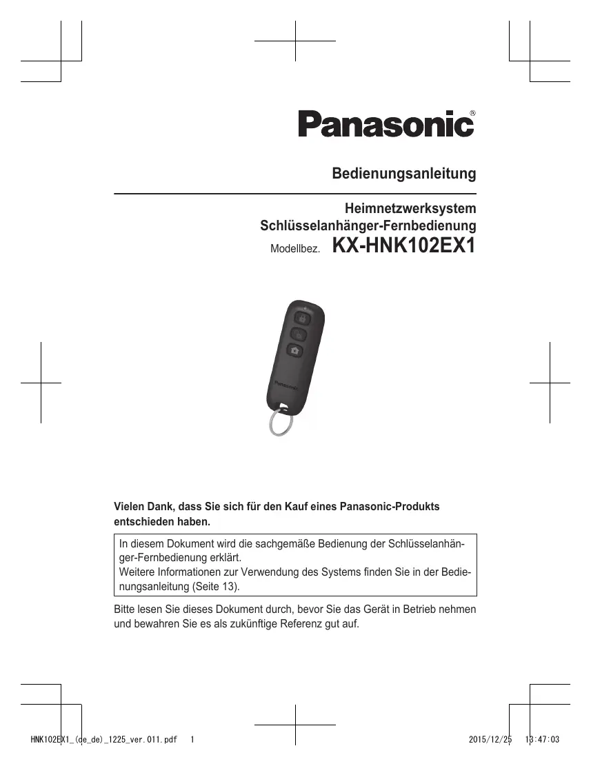 2015/12/25 13:43:52 Bedienungsanleitung Heimnetzwerksystem Schlüsselanhänger-Fernbedienung Modellbez. KX-HNK102EX1 Vielen Dank, dass Sie sich für den Kauf eines Panasonic-Produkts entschieden haben. In diesem Dokument wird die sachgemäße Bedienung der Schlüsselanhänger-Fernbedienung erklärt. Weitere Informationen zur Verwendung des Systems finden Sie in der Bedienungsanleitung (Seite 13). Bitte lesen Sie dieses Dokument durch, bevor Sie das Gerät in Betrieb nehmen und bewahren Sie es als zukünftige Referenz gut auf. HNK102EX1_(de_de)_1225_ver.011.pdf