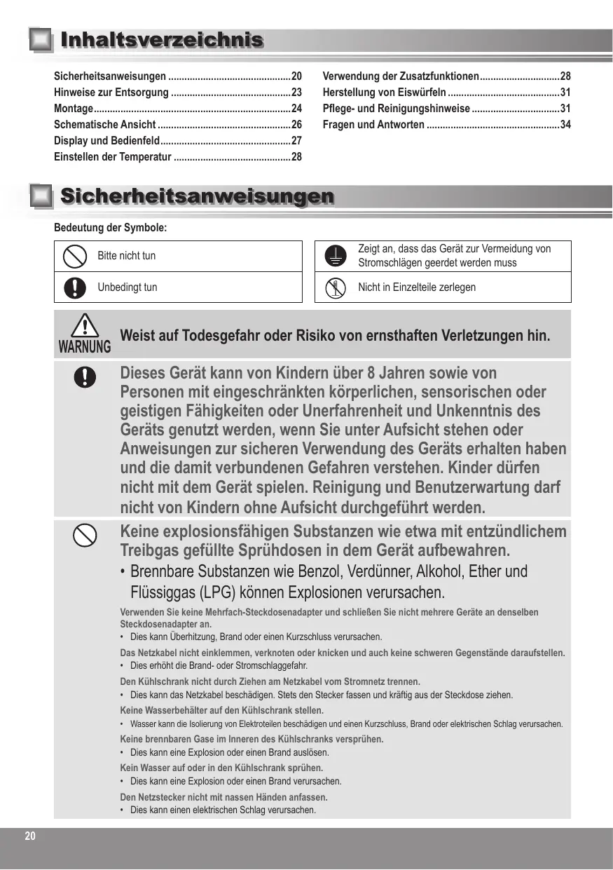 Dieses Gerät kann von Kindern über 8 Jahren sowie von Personen mit eingeschränkten körperlichen, sensorischen oder geistigen Fähigkeiten oder Unerfahrenheit und Unkenntnis des Geräts genutzt werden, wenn Sie unter Aufsicht stehen oder Anweisungen zur sicheren Verwendung des Geräts erhalten haben und die damit verbundenen Gefahren verstehen. Kinder dürfen nicht mit dem Gerät spielen. Reinigung und Benutzerwartung darf nicht von Kindern ohne Aufsicht durchgeführt werden. Keine explosionsfähigen Substanzen wie etwa mit entzündlichem Treibgas gefüllte Sprühdosen in dem Gerät aufbewahren. • Brennbare Substanzen wie Benzol, Verdünner, Alkohol, Ether und Flüssiggas (LPG) können Explosionen verursachen. Verwenden Sie keine Mehrfach-Steckdosenadapter und schließen Sie nicht mehrere Geräte an denselben Steckdosenadapter an. • Dies kann Überhitzung, Brand oder einen Kurzschluss verursachen. Das Netzkabel nicht einklemmen, verknoten oder knicken und auch keine schweren Gegenstände daraufstellen. • Dies erhöht die Brand- oder Stromschlaggefahr. Den Kühlschrank nicht durch Ziehen am Netzkabel vom Stromnetz trennen. • Dies kann das Netzkabel beschädigen. Stets den Stecker fassen und kräftig aus der Steckdose ziehen. Keine Wasserbehälter auf den Kühlschrank stellen. • Wasser kann die Isolierung von Elektroteilen beschädigen und einen Kurzschluss, Brand oder elektrischen Schlag verursachen.