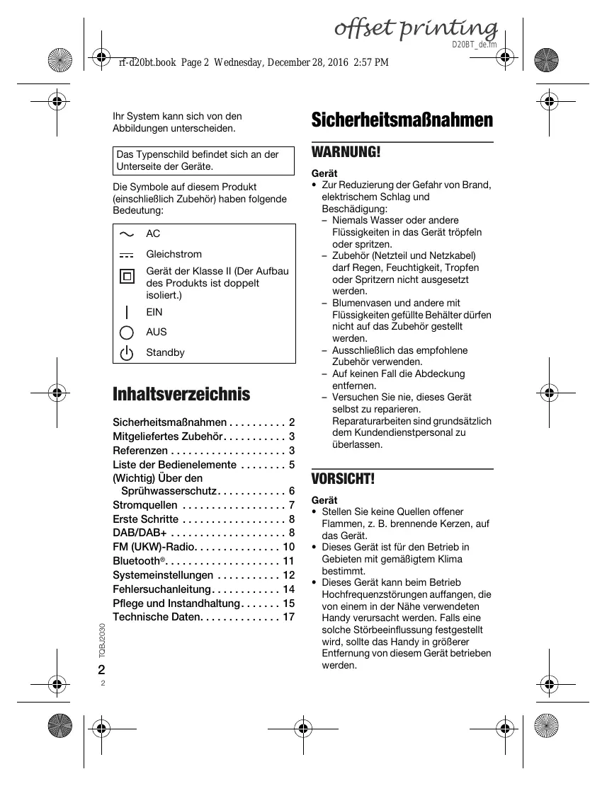 - TQBJ2030 offset printing D20BT_de.fm rf-d20bt.book Page 2 Wednesday, December 28, 2016 2:57 PM Ihr System kann sich von den Abbildungen unterscheiden. Das Typenschild befindet sich an der Unterseite der Geräte. Die Symbole auf diesem Produkt (einschließlich Zubehör) haben folgende Bedeutung: Gleichstrom Gerät der Klasse II (Der Aufbau des Produkts ist doppelt isoliert.) EIN AUS Standby Inhaltsverzeichnis TQBJ2030 Sicherheitsmaßnahmen p. 2