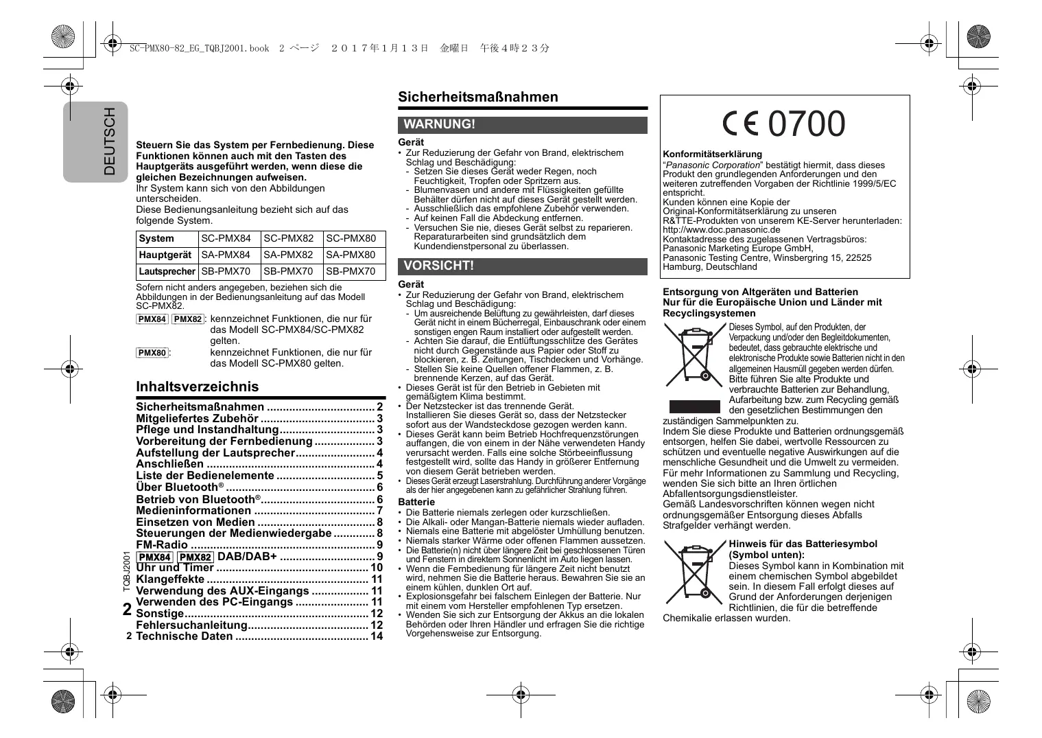 - DEUTSCH Sicherheitsmaßnahmen WARNUNG! Steuern Sie das System per Fernbedienung. Diese Funktionen können auch mit den Tasten des Hauptgeräts ausgeführt werden, wenn diese die gleichen Bezeichnungen aufweisen. Ihr System kann sich von den Abbildungen unterscheiden. Diese Bedienungsanleitung bezieht sich auf das folgende System. System SC-PMX84 SC-PMX82 SC-PMX80 Hauptgerät SA-PMX84 SA-PMX82 SA-PMX80 Lautsprecher SB-PMX70 SB-PMX70 SB-PMX70 Sofern nicht anders angegeben, beziehen sich die Abbildungen in der Bedienungsanleitung auf das Modell SC-PMX82. [PMX84] [PMX82]: kennzeichnet Funktionen, die nur für das Modell SC-PMX84/SC-PMX82 gelten. [PMX80]: kennzeichnet Funktionen, die nur für das Modell SC-PMX80 gelten. Inhaltsverzeichnis TQBJ2001 Sicherheitsmaßnahmen p. 2