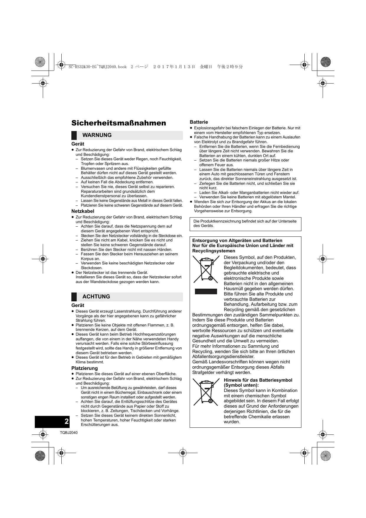 Batterie ≥ Explosionsgefahr bei falschem Einlegen der Batterie. Nur mit einem vom Hersteller empfohlenen Typ ersetzen. ≥ Falsche Handhabung der Batterien kann zu einem Auslaufen von Elektrolyt und zu Brandgefahr führen. – Entfernen Sie die Batterien, wenn Sie die Fernbedienung über längere Zeit nicht verwenden. Bewahren Sie die Batterien an einem kühlen, dunklen Ort auf. – Setzen Sie die Batterien niemals großer Hitze oder offenem Feuer aus. – Lassen Sie die Batterien niemals über längere Zeit in einem Auto mit geschlossenen Türen und Fenstern zurück, das direkter Sonneneinstrahlung ausgesetzt ist. – Zerlegen Sie die Batterien nicht, und schließen Sie sie nicht kurz. – Laden Sie Alkali- oder Manganbatterien nicht wieder auf. – Verwenden Sie keine Batterien mit abgelöstem Mantel. ≥ Wenden Sie sich zur Entsorgung der Akkus an die lokalen Behörden oder Ihren Händler und erfragen Sie die richtige Vorgehensweise zur Entsorgung. Die Produktkennzeichnung befindet sich auf der Unterseite des Geräts. Entsorgung von Altgeräten und Batterien Nur für die Europäische Union und Länder mit Recyclingsystemen Dieses Symbol, auf den Produkten, der Verpackung und/oder den Begleitdokumenten, bedeutet, dass gebrauchte elektrische und elektronische Produkte sowie Batterien nicht in den allgemeinen Hausmüll gegeben werden dürfen. Bitte führen Sie alte Produkte und verbrauchte Batterien zur Behandlung, Aufarbeitung bzw. zum Recycling gemäß den gesetzlichen Bestimmungen den zuständigen Sammelpunkten zu. Indem Sie diese Produkte und Batterien ordnungsgemäß entsorgen, helfen Sie dabei, wertvolle Ressourcen zu schützen und eventuelle negative Auswirkungen auf die menschliche Gesundheit und die Umwelt zu vermeiden. Für mehr Informationen zu Sammlung und Recycling, wenden Sie sich bitte an Ihren örtlichen Abfallentsorgungsdienstleister. Gemäß Landesvorschriften können wegen nicht ordnungsgemäßer Entsorgung dieses Abfalls Strafgelder verhängt werden. Hinweis für das Batteriesymbol (Symbol unten): Dieses Symbol kann in Kombination mit einem chemischen Symbol abgebildet sein. In diesem Fall erfolgt dieses auf Grund der Anforderungen derjenigen Richtlinien, die für die betreffende Chemikalie erlassen wurden. SC-RS32&30-EG~TQBJ2040.book 3 ページ