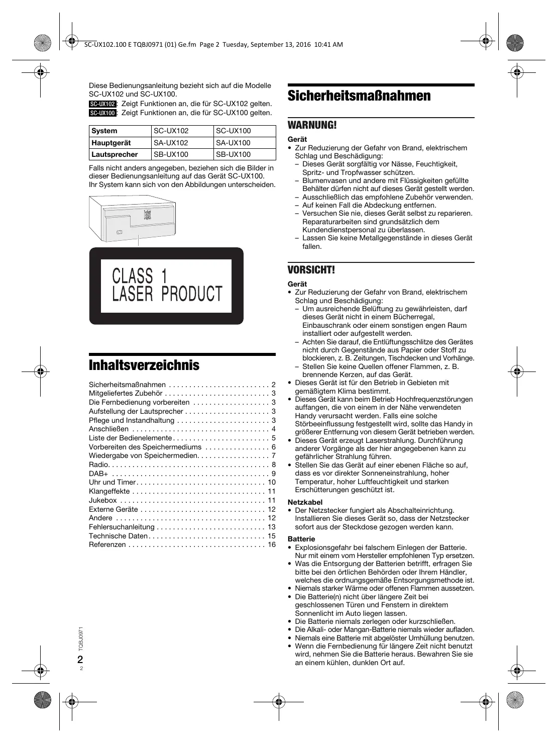 TQBJ0971 SC-UX102.100 E TQBJ0971 (01) Ge.fm Page 2 Tuesday, September 13, 2016 10:41 AM Diese Bedienungsanleitung bezieht sich auf die Modelle SC-UX102 und SC-UX100. SC-UX102 : Zeigt Funktionen an, die für SC-UX102 gelten. SC-UX100 : Zeigt Funktionen an, die für SC-UX100 gelten. System SC-UX102 SC-UX100 Hauptgerät SA-UX102 SA-UX100 Lautsprecher SB-UX100 SB-UX100 Falls nicht anders angegeben, beziehen sich die Bilder in dieser Bedienungsanleitung auf das Gerät SC-UX100. Ihr System kann sich von den Abbildungen unterscheiden. Sicherheitsmaßnahmen WARNUNG! Gerät