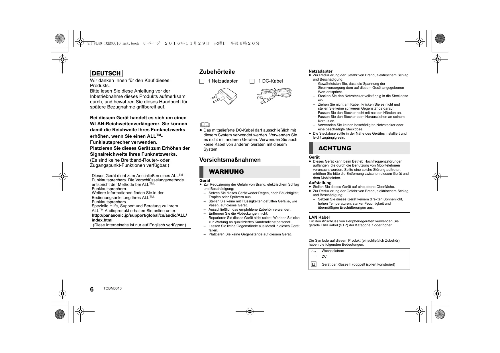 Bei diesem Gerät handelt es sich um einen WLAN-Reichweitenverlängerer. Sie können damit die Reichweite Ihres Funknetzwerks erhöhen, wenn Sie einen ALLTMFunklautsprecher verwenden. Platzieren Sie dieses Gerät zum Erhöhen der Signalreichweite Ihres Funknetzwerks. (Es sind keine Breitband-Router- oder Zugangspunkt-Funktionen verfügbar.) Dieses Gerät dient zum Anschließen eines ALLTMFunklautsprechers. Die Verschlüsselungsmethode entspricht der Methode bei ALLTMFunklautsprechern. Weitere Informationen finden Sie in der Bedienungsanleitung Ihres ALLTMFunklautsprechers. Spezielle Hilfe, Support und Beratung zu Ihrem ALLTM-Audioprodukt erhalten Sie online unter: http://panasonic.jp/support/global/cs/audio/ALL/ index.html (Diese Internetseite ist nur auf Englisch verfügbar.)