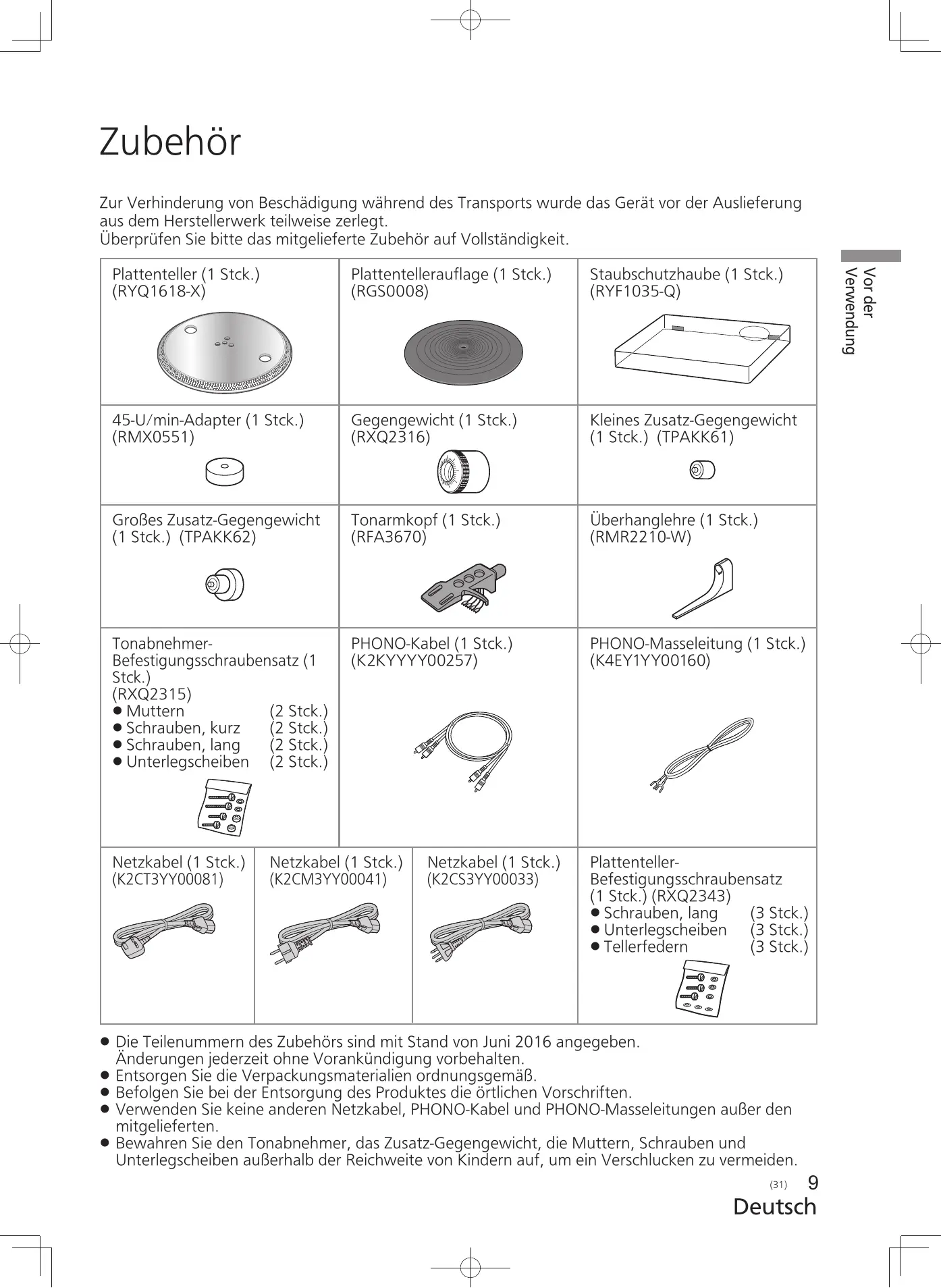 )UPHKU,QIRUPDWLRQHQ]X6DPPOXQJXQG5HF\FOLQJZHQGHQ6LHVLFKELWWHDQ,KUHQ|UWOLFKHQ$EIDOOHQWVRUJXQJVGLHQVWOHLVWHU *HPl/DQGHVYRUVFKULIWHQN|QQHQZHJHQQLFKWRUGQXQJVJHPlHU(QWVRUJXQJGLHVHV$EIDOOV6WUDIJHOGHUYHUKlQJWZHUGHQ 8 (30) Deutsch Zubehör Zur Verhinderung von Beschädigung während des Transports wurde das Gerät vor der Auslieferung aus dem Herstellerwerk teilweise zerlegt. Überprüfen Sie bitte das mitgelieferte Zubehör auf Vollständigkeit. Plattentellerauflage (1 Stck.) (RGS0008) Staubschutzhaube (1 Stck.) (RYF1035-Q) 45-U/min-Adapter (1 Stck.) (RMX0551) Gegengewicht (1 Stck.) (RXQ2316) Kleines Zusatz-Gegengewicht (1 Stck.) (TPAKK61) Großes Zusatz-Gegengewicht (1 Stck.) (TPAKK62) Tonarmkopf (1 Stck.) (RFA3670) Überhanglehre (1 Stck.) (RMR2210-W) TonabnehmerBefestigungsschraubensatz (1 Stck.) (RXQ2315) (2 Stck.) Muttern (2 Stck.) Schrauben, kurz (2 Stck.) Schrauben, lang Unterlegscheiben (2 Stck.) PHONO-Kabel (1 Stck.) (K2KYYYY00257) PHONO-Masseleitung (1 Stck.) (K4EY1YY00160) Netzkabel (1 Stck.) (K2CT3YY00081) Netzkabel (1 Stck.) (K2CM3YY00041) Netzkabel (1 Stck.) (K2CS3YY00033) PlattentellerBefestigungsschraubensatz (1 Stck.) (RXQ2343) (3 Stck.) Schrauben, lang (3 Stck.) Unterlegscheiben (3 Stck.) Tellerfedern Die Teilenummern des Zubehörs sind mit Stand von Juni 2016 angegeben. Änderungen jederzeit ohne Vorankündigung vorbehalten. Entsorgen Sie die Verpackungsmaterialien ordnungsgemäß. Befolgen Sie bei der Entsorgung des Produktes die örtlichen Vorschriften. Verwenden Sie keine anderen Netzkabel, PHONO-Kabel und PHONO-Masseleitungen außer den mitgelieferten. Bewahren Sie den Tonabnehmer, das Zusatz-Gegengewicht, die Muttern, Schrauben und Unterlegscheiben außerhalb der Reichweite von Kindern auf, um ein Verschlucken zu vermeiden.