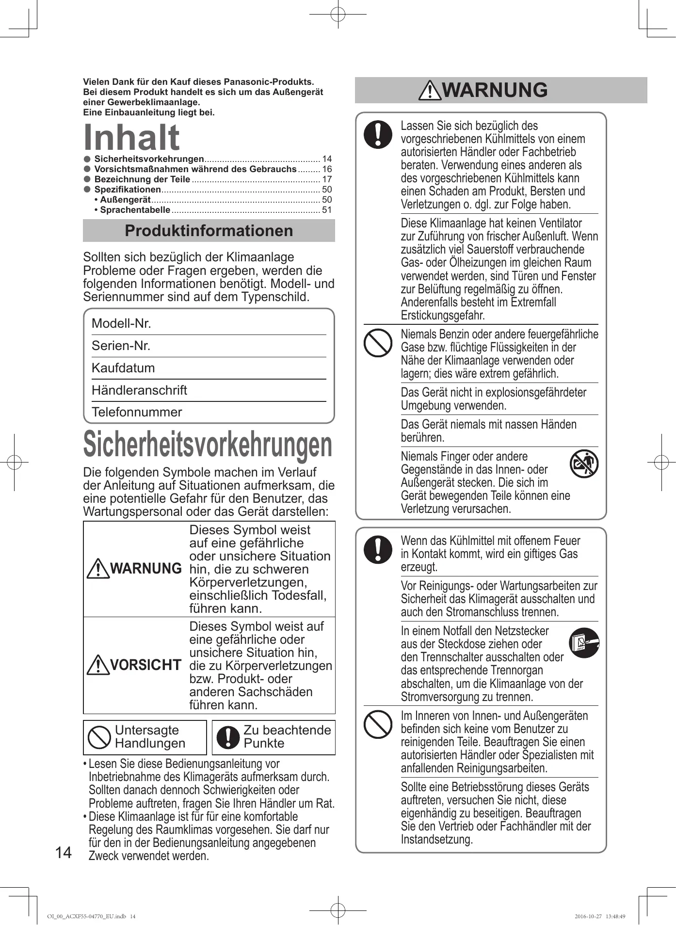 - OI_00_ACXF55-04770_EU.indb 13 2016-10-27 13:48:47 Vielen Dank für den Kauf dieses Panasonic-Produkts. Bei diesem Produkt handelt es sich um das Außengerät einer Gewerbeklimaanlage. Eine Einbauanleitung liegt bei. Inhalt Sicherheitsvorkehrungen p. 14