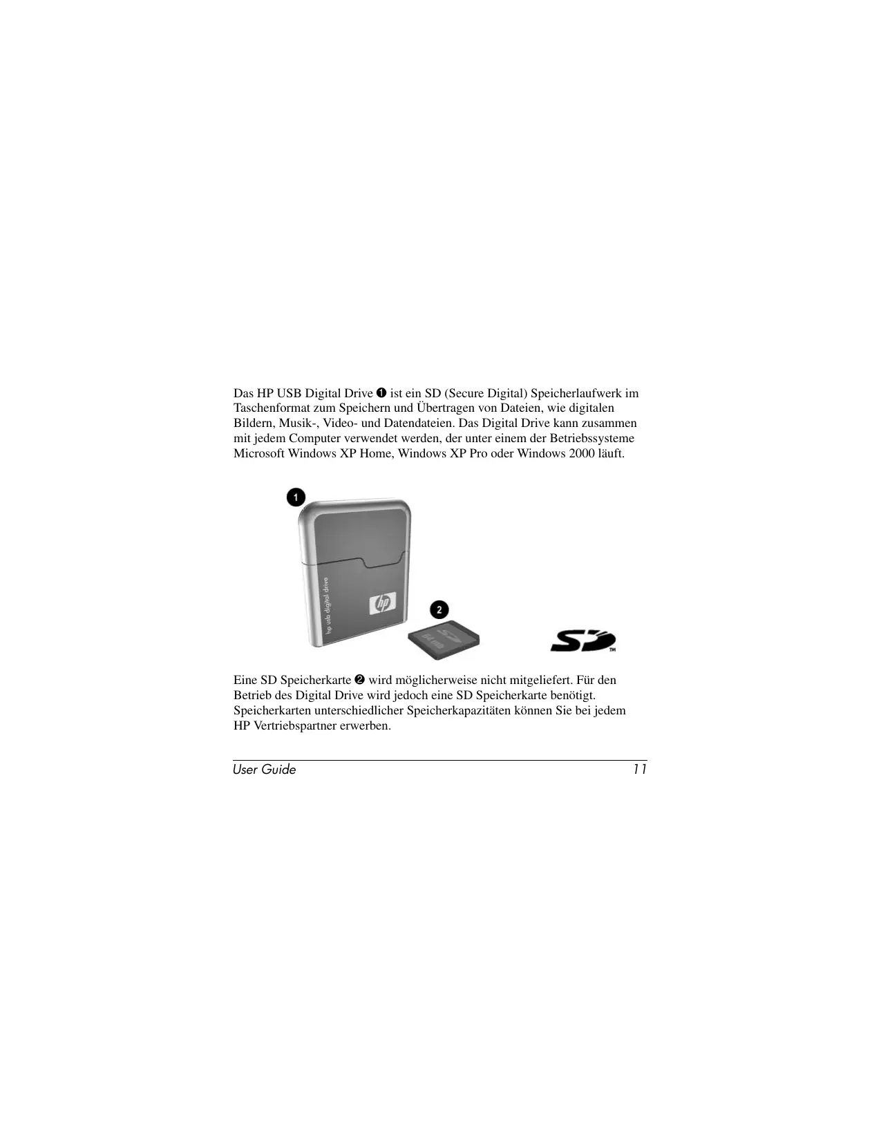 The HP USB Digital Drive Conditions under which the problem occurred Error messages that have occurred Hardware and software you are using User Guide Das HP USB Digital Drive 1 ist ein SD (Secure Digital) Speicherlaufwerk im Taschenformat zum Speichern und Übertragen von Dateien, wie digitalen Bildern, Musik-, Video- und Datendateien. Das Digital Drive kann zusammen mit jedem Computer verwendet werden, der unter einem der Betriebssysteme Microsoft Windows XP Home, Windows XP Pro oder Windows 2000 läuft. Eine SD Speicherkarte 2 wird möglicherweise nicht mitgeliefert. Für den Betrieb des Digital Drive wird jedoch eine SD Speicherkarte benötigt. Speicherkarten unterschiedlicher Speicherkapazitäten können Sie bei jedem HP Vertriebspartner erwerben. User Guide