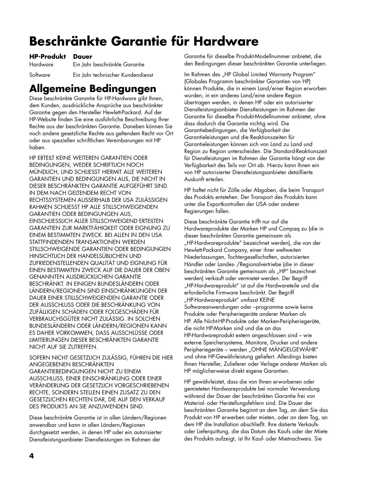 Garantie für dieselbe Produkt-Modellnummer anbietet, die den Bedingungen dieser beschränkten Garantie unterliegen. Im Rahmen des „HP Global Limited Warranty Program” (Globales Programm beschränkter Garantien von HP) können Produkte, die in einem Land/einer Region erworben wurden, in ein anderes Land/eine andere Region übertragen werden, in denen HP oder ein autorisierter Dienstleistungsanbieter Dienstleistungen im Rahmen der Garantie für dieselbe Produkt-Modellnummer anbietet, ohne dass dadurch die Garantie nichtig wird. Die Garantiebedingungen, die Verfügbarkeit der Garantieleistungen und die Reaktionszeiten für Garantieleistungen können sich von Land zu Land und Region zu Region unterscheiden. Die Standard-Reaktionszeit für Dienstleistungen im Rahmen der Garantie hängt von der Verfügbarkeit des Teils vor Ort ab. Hierzu kann Ihnen ein von HP autorisierter Dienstleistungsanbieter detaillierte Auskunft erteilen. HP haftet nicht für Zölle oder Abgaben, die beim Transport des Produkts entstehen. Der Transport des Produkts kann unter die Exportkontrollen der USA oder anderer Regierungen fallen. Diese beschränkte Garantie trifft nur auf die Hardwareprodukte der Marken HP und Compaq zu (die in dieser beschränkten Garantie gemeinsam als „HP-Hardwareprodukte” bezeichnet werden), die von der Hewlett-Packard Company, einer ihrer weltweiten Niederlassungen, Tochtergesellschaften, autorisierten Händler oder Landes- /Regionalvertriebe (die in dieser beschränkten Garantie gemeinsam als „HP” bezeichnet werden) verkauft oder vermietet werden. Der Begriff „HP-Hardwareprodukt” ist auf die Hardwareteile und die erforderliche Firmware beschränkt. Der Begriff „HP-Hardwareprodukt” umfasst KEINE Softwareanwendungen oder –programme sowie keine Produkte oder Peripheriegeräte anderer Marken als HP. Alle Nicht-HP-Produkte oder Marken-Peripheriegeräte, die nicht HP-Marken sind und die an das HP-Hardwareprodukt extern angeschlossen sind – wie externe Speichersysteme, Monitore, Drucker und andere Peripheriegeräte – werden „OHNE MÄNGELGEWÄHR” und ohne HP-Gewährleistung geliefert. Allerdings bieten Ihnen Hersteller, Zulieferer oder Verlage anderer Marken als HP möglicherweise direkt eigene Garantien. HP gewährleistet, dass die von Ihnen erworbenen oder gemieteten Hardwareprodukte bei normaler Verwendung während der Dauer der beschränkten Garantie frei von Material- oder Herstellungsfehlern sind. Die Dauer der beschränkten Garantie beginnt an dem Tag, an dem Sie das Produkt von HP erwerben oder mieten, oder an dem Tag, an dem HP die Installation abschließt. Ihre datierte Verkaufsoder Lieferquittung, die das Datum des Kaufs oder der Miete des Produkts aufzeigt, ist Ihr Kauf- oder Mietnachweis. Sie müssen möglicherweise einen Kauf- oder Mietnachweis vorlegen, um Serviceleistungen aus der Garantie zu erhalten. Sie haben Anspruch auf Serviceleistungen aus der Garantie gemäß den Bedingungen dieses Dokuments, wenn eine Reparatur Ihres HP-Hardwareprodukts innerhalb der Dauer Ihrer beschränkten Garantie notwendig wird. andere Firma als (i) HP, (ii) einen autorisierten HPDienstleistungsanbieter oder (iii) die von Ihnen selbst durchgeführte Installation von ersetzbaren Kundenteilen oder von HP genehmigten Teilen, sofern diese in dem Land/der Region, in denen die Reparatur durchgeführt wird, für Ihr Produkt verfügbar sind, beschädigt wurden. Sofern nicht anders angegeben und soweit durch örtliches Recht zugelassen, können HP-Hardwareprodukte mit neuen Materialien oder neuen und gebrauchten Materialien hergestellt werden, deren Leistung und Zuverlässigkeit der neuer Materialien entspricht. HP kann die HP-Hardwareprodukte mit (a) neuen oder zuvor verwendeten Produkten oder Teilen, deren Leistung oder Zuverlässigkeit der neuer Materialien entspricht, reparieren oder ersetzen oder (b) mit Produkten reparieren oder ersetzen, die mit einem Originalprodukt gleichwertig sind, dessen Produktion eingestellt wurde. Die Garantie auf Ersatzteile für Material- oder Herstellungsfehler erstreckt sich über neunzig (90) Tage oder über den Rest der Garantiedauer des HP-Hardwareprodukts, das ersetzt wird oder in das dieses Produkt installiert wird, je nachdem, welcher Zeitraum länger ist. SIE SOLLTEN REGELMÄßIG SICHERUNGSKOPIEN DER AUF IHRER FESTPLATTE ODER AUF ANDEREN GERÄTEN GESPEICHERTEN DATEN FÜR DEN FALL
