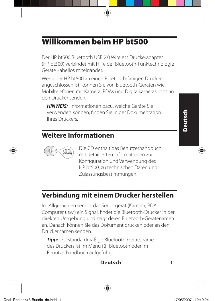 Weitere Informationen Die CD enthält das Benutzerhandbuch mit detaillierten Informationen zur Konfiguration und Verwendung des HP bt500, zu technischen Daten und Zulassungsbestimmungen.