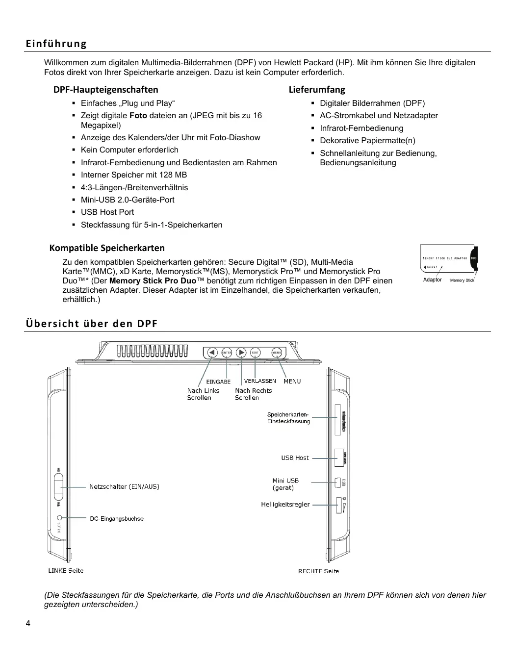 Inhalt Einführung 4 DPF-Haupteigenschaften 4 Lieferumfang 4 Kompatible Speicherkarten 4