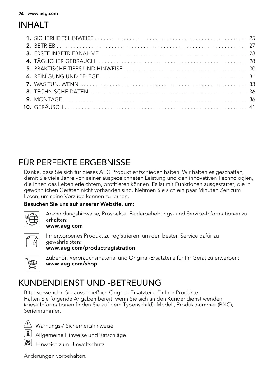 Danke, dass Sie sich für dieses AEG Produkt entschieden haben. Wir haben es geschaffen, damit Sie viele Jahre von seiner ausgezeichneten Leistung und den innovativen Technologien, die Ihnen das Leben erleichtern, profitieren können. Es ist mit Funktionen ausgestattet, die in gewöhnlichen Geräten nicht vorhanden sind. Nehmen Sie sich ein paar Minuten Zeit zum Lesen, um seine Vorzüge kennen zu lernen. Besuchen Sie uns auf unserer Website, um: Anwendungshinweise, Prospekte, Fehlerbehebungs- und Service-Informationen zu erhalten: www.aeg.com Ihr erworbenes Produkt zu registrieren, um den besten Service dafür zu gewährleisten: www.aeg.com/productregistration Zubehör, Verbrauchsmaterial und Original-Ersatzteile für Ihr Gerät zu erwerben: www.aeg.com/shop