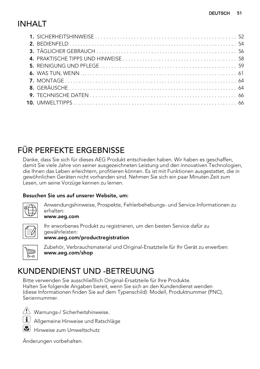 FÜR PERFEKTE ERGEBNISSE Danke, dass Sie sich für dieses AEG Produkt entschieden haben. Wir haben es geschaffen, damit Sie viele Jahre von seiner ausgezeichneten Leistung und den innovativen Technologien, die Ihnen das Leben erleichtern, profitieren können. Es ist mit Funktionen ausgestattet, die in gewöhnlichen Geräten nicht vorhanden sind. Nehmen Sie sich ein paar Minuten Zeit zum Lesen, um seine Vorzüge kennen zu lernen. Besuchen Sie uns auf unserer Website, um: Anwendungshinweise, Prospekte, Fehlerbehebungs- und Service-Informationen zu erhalten: www.aeg.com Ihr erworbenes Produkt zu registrieren, um den besten Service dafür zu gewährleisten: www.aeg.com/productregistration Zubehör, Verbrauchsmaterial und Original-Ersatzteile für Ihr Gerät zu erwerben: www.aeg.com/shop