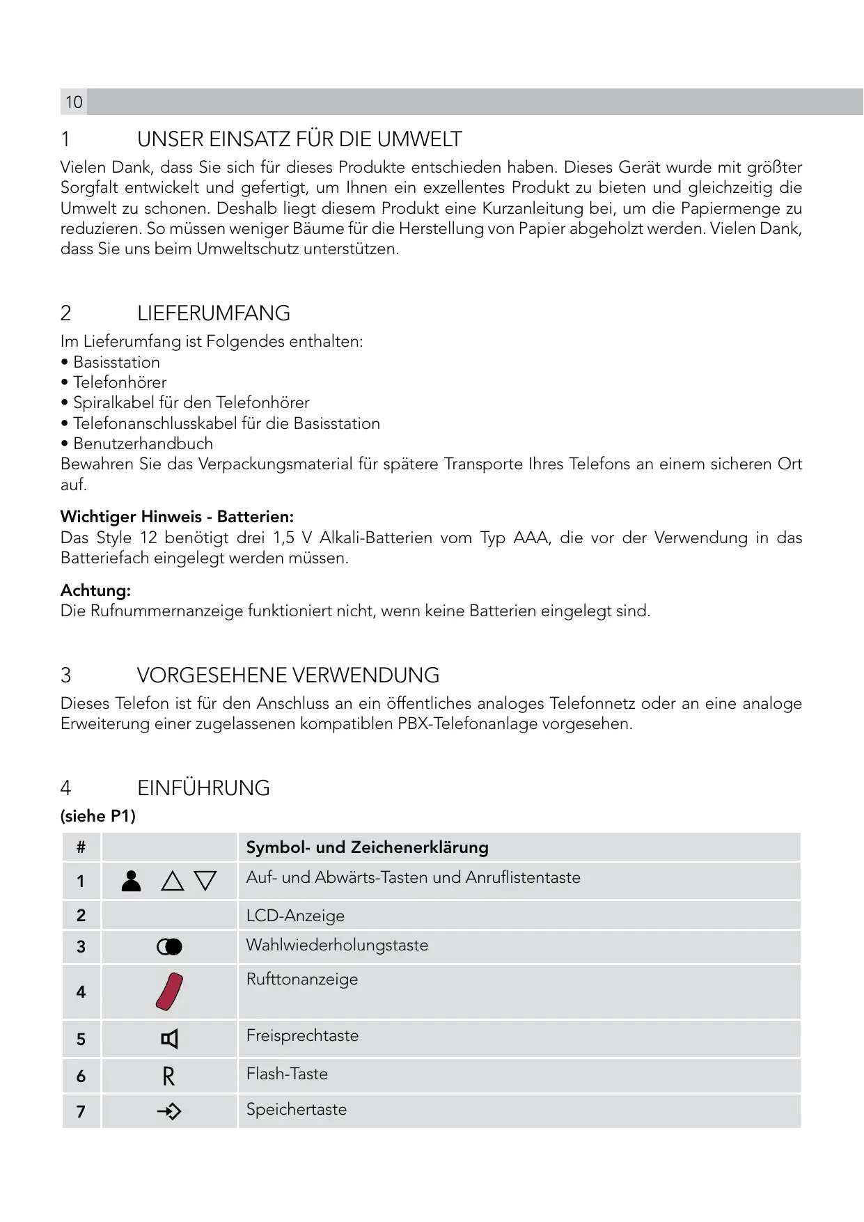 LIEFERUMFANG Im Lieferumfang ist Folgendes enthalten: tBasisstation tTelefonhörer tSpiralkabel für den Telefonhörer tTelefonanschlusskabel für die Basisstation tBenutzerhandbuch Bewahren Sie das Verpackungsmaterial für spätere Transporte Ihres Telefons an einem sicheren Ort auf. Wichtiger Hinweis - Batterien: Das Style 12 benötigt drei 1,5 V Alkali-Batterien vom Typ AAA, die vor der Verwendung in das Batteriefach eingelegt werden müssen. Achtung: Die Rufnummernanzeige funktioniert nicht, wenn keine Batterien eingelegt sind.