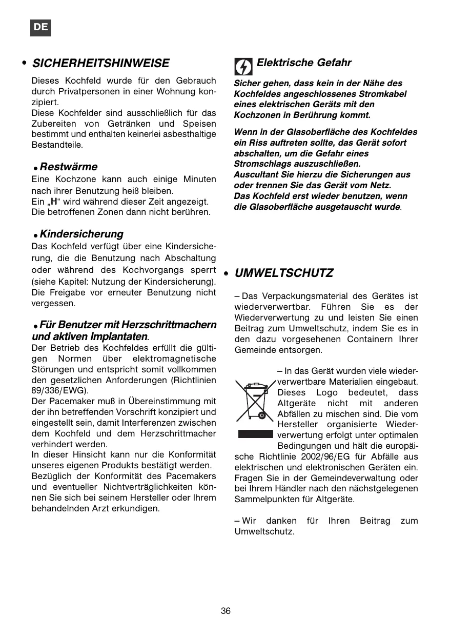 - Für Benutzer mit Herzschrittmachern und aktiven Implantaten. Der Betrieb des Kochfeldes erfüllt die gültigen Normen über elektromagnetische Störungen und entspricht somit vollkommen den gesetzlichen Anforderungen (Richtlinien 89/336/EWG). Der Pacemaker muß in Übereinstimmung mit der ihn betreffenden Vorschrift konzipiert und eingestellt sein, damit Interferenzen zwischen dem Kochfeld und dem Herzschrittmacher verhindert werden. In dieser Hinsicht kann nur die Konformität unseres eigenen Produkts bestätigt werden. Bezüglich der Konformität des Pacemakers und eventueller Nichtverträglichkeiten können Sie sich bei seinem Hersteller oder Ihrem behandelnden Arzt erkundigen. — In das Gerät wurden viele wiederverwertbare Materialien eingebaut. Dieses Logo bedeutet, dass Altgeräte nicht mit anderen Abfällen zu mischen sind. Die vom Hersteller organisierte Wiederverwertung erfolgt unter optimalen Bedingungen und hält die europäische Richtlinie 2002/96/EG für Abfälle aus elektrischen und elektronischen Geräten ein. Fragen Sie in der Gemeindeverwaltung oder bei Ihrem Händler nach den nächstgelegenen Sammelpunkten für Altgeräte. — Wir danken Umweltschutz.