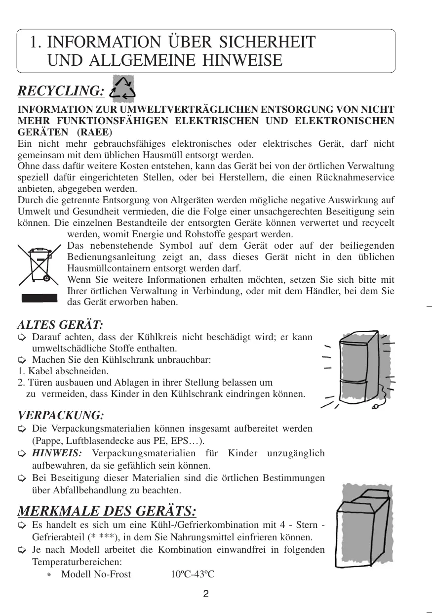 zu vermeiden, dass Kinder in den Kühlschrank eindringen können. VERPACKUNG: Die Verpackungsmaterialien können insgesamt aufbereitet werden (Pappe, Luftblasendecke aus PE, EPS…). HINWEIS: Verpackungsmaterialien für Kinder unzugänglich aufbewahren, da sie gefählich sein können. Bei Beseitigung dieser Materialien sind die örtlichen Bestimmungen über Abfallbehandlung zu beachten. MERKMALE DES GERÄTS: Es handelt es sich um eine Kühl-/Gefrierkombination mit 4 - Stern Gefrierabteil (* ***), in dem Sie Nahrungsmittel einfrieren können. Je nach Modell arbeitet die Kombination einwandfrei in folgenden Temperaturbereichen: