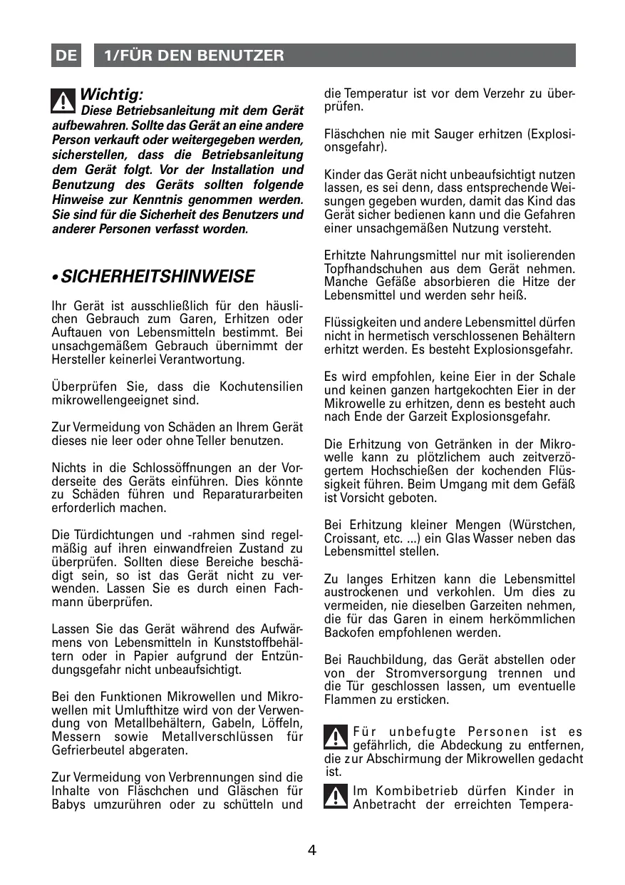 - SIcHERHEITSHINWEISE ihr Gerät ist ausschließlich für den häuslichen Gebrauch zum Garen, Erhitzen oder auftauen von lebensmitteln bestimmt. Bei unsachgemäßem Gebrauch übernimmt der Hersteller keinerlei Verantwortung. Flüssigkeiten und andere lebensmittel dürfen nicht in hermetisch verschlossenen Behältern erhitzt werden. Es besteht Explosionsgefahr. Es wird empfohlen, keine Eier in der Schale und keinen ganzen hartgekochten Eier in der Mikrowelle zu erhitzen, denn es besteht auch nach Ende der Garzeit Explosionsgefahr. Überprüfen Sie, dass die Kochutensilien mikrowellengeeignet sind. Zur Vermeidung von Schäden an ihrem Gerät dieses nie leer oder ohne Teller benutzen. Die Erhitzung von Getränken in der Mikrowelle kann zu plötzlichem auch zeitverzögertem Hochschießen der kochenden Flüssigkeit führen. Beim Umgang mit dem Gefäß ist Vorsicht geboten. Nichts in die Schlossöffnungen an der Vorderseite des Geräts einführen. Dies könnte zu Schäden führen und Reparaturarbeiten erforderlich machen. Bei Erhitzung kleiner Mengen (Würstchen, Croissant, etc. ...) ein Glas Wasser neben das lebensmittel stellen. Die Türdichtungen und -rahmen sind regelmäßig auf ihren einwandfreien Zustand zu überprüfen. Sollten diese Bereiche beschädigt sein, so ist das Gerät nicht zu verwenden. lassen Sie es durch einen Fachmann überprüfen. Zu langes Erhitzen kann die lebensmittel austrockenen und verkohlen. Um dies zu vermeiden, nie dieselben Garzeiten nehmen, die für das Garen in einem herkömmlichen Backofen empfohlenen werden. lassen Sie das Gerät während des aufwärmens von lebensmitteln in Kunststoffbehältern oder in Papier aufgrund der Entzündungsgefahr nicht unbeaufsichtigt. Bei Rauchbildung, das Gerät abstellen oder von der Stromversorgung trennen und die Tür geschlossen lassen, um eventuelle Flammen zu ersticken. Bei den Funktionen Mikrowellen und Mikrowellen mit Umlufthitze wird von der Verwendung von Metallbehältern, Gabeln, löffeln, Messern sowie Metallverschlüssen für Gefrierbeutel abgeraten. F ü r unbefugte Per sonen ist es gefährlich, die abdeckung zu entfernen, die zur abschirmung der Mikroweiien geda cht ist. im Kombibetrieb dürfen Kinder in anbetracht der erreichten Tempera- Zur Vermeidung von Verbrennungen sind die inhalte von Fläschchen und Gläschen für Babys umzurühren oder zu schütteln und