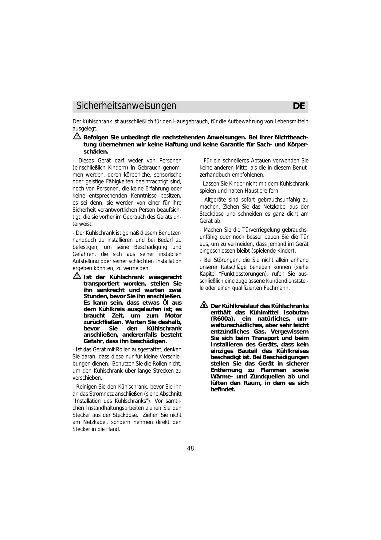 Der Kühlschrank ist ausschließlich für den Hausgebrauch, für die Aufbewahrung von Lebensmitteln ausgelegt. Befolgen Sie unbedingt die nachstehenden Anweisungen. Bei ihrer Nichtbeach- tung übernehmen wir keine Haftung und keine Garantie für Sach- und Körperschäden. - Für ein schnelleres Abtauen verwenden Sie keine anderen Mittel als die in diesem Benutzerhandbuch empfohlenen. - Dieses Gerät darf weder von Personen (einschließlich Kindern) in Gebrauch genommen werden, deren körperliche, sensorische oder geistige Fähigkeiten beeinträchtigt sind, noch von Personen, die keine Erfahrung oder keine entsprechenden Kenntnisse besitzen, es sei denn, sie werden von einer für ihre Sicherheit verantwortlichen Person beaufsichtigt, die sie vorher im Gebrauch des Geräts unterweist. - Lassen Sie Kinder nicht mit dem Kühlschrank spielen und halten Haustiere fern. - Altgeräte sind sofort gebrauchsunfähig zu machen. Ziehen Sie das Netzkabel aus der Steckdose und schneiden es ganz dicht am Gerät ab. - Machen Sie die Türverriegelung gebrauchsunfähig oder noch besser bauen Sie die Tür aus, um zu vermeiden, dass jemand im Gerät eingeschlossen bleibt (spielende Kinder). - Der Kühlschrank ist gemäß diesem Benutzerhandbuch zu installieren und bei Bedarf zu befestigen, um seine Beschädigung und Gefahren, die sich aus seiner instabilen Aufstellung oder seiner schlechten Installation ergeben könnten, zu vermeiden. - Bei Störungen, die Sie nicht allein anhand unserer Ratschläge beheben können (siehe Kapitel “Funktiosstörungen), rufen Sie ausschließlich eine zugelassene Kundendienststelle oder einen qualifizierten Fachmann. Ist der Kühlschrank waagerecht transportiert worden, stellen Sie ihn senkrecht und warten zwei Stunden, bevor Sie ihn anschließen. Es kann sein, dass etwas Öl aus dem Kühlkreis ausgelaufen ist; es braucht Zeit, um zum Motor zurückfließen. Warten Sie deshalb, bevor Sie den Kühlschrank anschließen, anderenfalls besteht Gefahr, dass ihn beschädigen. - Ist das Gerät mit Rollen ausgestattet, denken Sie daran, dass diese nur für kleine Verschiebungen dienen. Benutzen Sie die Rollen nicht, um den Kühlschrank über lange Strecken zu verschieben. Der Kühlkreislauf des Kühlschranks enthält das Kühlmittel Isobutan (R600a), ein natürliches, umweltunschädliches, aber sehr leicht entzündliches Gas. Vergewissern Sie sich beim Transport und beim Installieren des Geräts, dass kein einziges Bauteil des Kühlkreises beschädigt ist. Bei Beschädigungen stellen Sie das Gerät in sicherer Entfernung zu Flammen sowie Wärme- und Zündquellen ab und lüften den Raum, in dem es sich befindet. - Reinigen Sie den Kühlschrank, bevor Sie ihn an das Stromnetz anschließen (siehe Abschnitt "Installation des Kühlschranks"). Vor sämtlichen Instandhaltungsarbeiten ziehen Sie den Stecker aus der Steckdose. Ziehen Sie nicht am Netzkabel, sondern nehmen direkt den Stecker in die Hand.