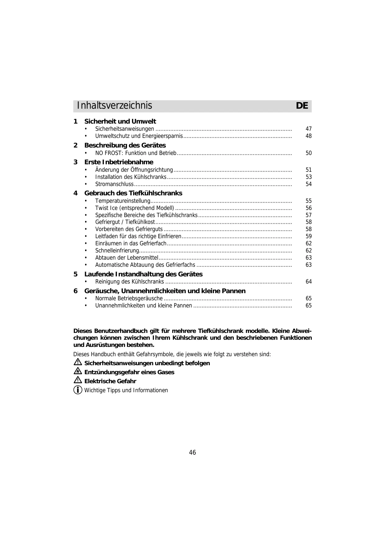 Dieses Benutzerhandbuch gilt für mehrere Tiefkühlschrank modelle. Kleine Abweichungen können zwischen Ihrem Kühlschrank und den beschriebenen Funktionen und Ausrüstungen bestehen. Dieses Handbuch enthält Gefahrsymbole, die jeweils wie folgt zu verstehen sind: Sicherheitsanweisungen unbedingt befolgen Entzündungsgefahr eines Gases Elektrische Gefahr Wichtige Tipps und Informationen
