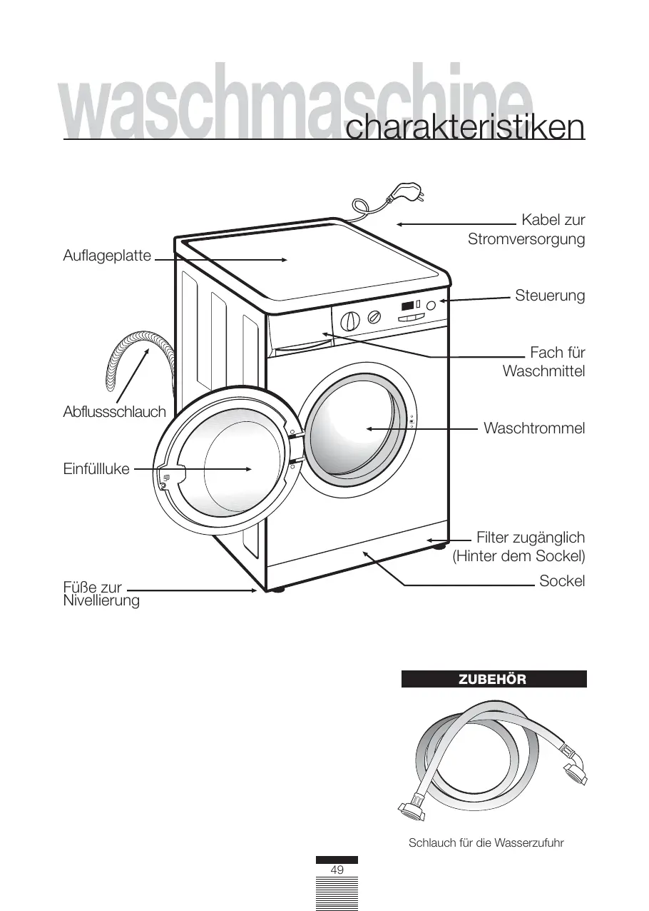 waschmaschine charakteristiken Kabel zur Stromversorgung Auflageplatte Steuerung Fach für Waschmittel Abflussschlauch Waschtrommel Einfüllluke Filter zugänglich (Hinter dem Sockel) Sockel Füße zur Nivellierung ZUBEHÖR Schlauch für die Wasserzufuhr