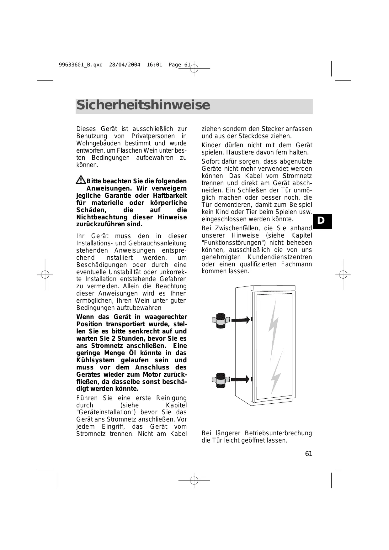Si l'appareil a été transporté chez vous en position horizontale, mettez le à la verticale et attendez 2 heures avant de le brancher. Une petite quantité d'huile peut s'être écoulée dans le circuit de réfrigération, vous devez lui laisser le temps de refluer vers le moteur avant de brancher l'appareil, faute de quoi vous risquez de l'endommager. Procédez au premier nettoyage (voir chapitre "Installation de votre appareil") avant de brancher votre appareil au réseau électrique. Avant toute opération d'entretien, débranchez votre appareil. Ne tirez pas sur le cordon d'alimentation, mais saisissez directement la prise. Ne laissez pas les enfants jouer avec l'appareil, éloignez les animaux domestiques. 4