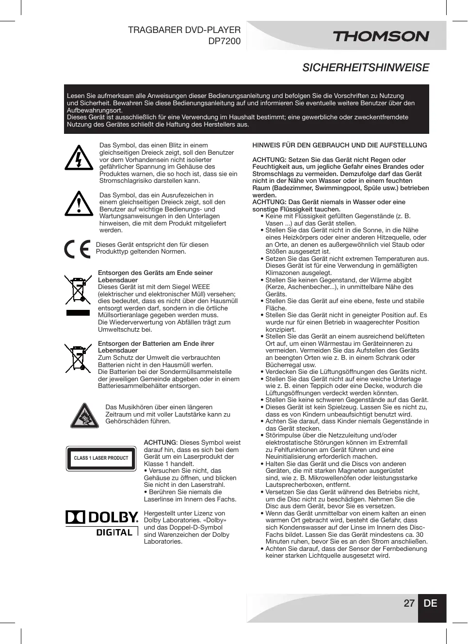 - If it is not used for a long time, unplug the appliance and remove the batteries. is a trademark of TECHNICOLOR S.A. used under license by: Parsons International France - 19 Boulevard Albert Einstein 77420 Champs sur Marne - France N°Azur (+33)0825 745 770 call rate according to operator French time: Monday to Thursday (from 9 am to 18 pm) and Friday (9 am to 3:30 p.m.) www.thomsonaudiovideo.eu EN 26 TRAGBARER DVD-PLAYER DP7200 SICHERHEITSHINWEISE Lesen Sie aufmerksam alle Anweisungen dieser Bedienungsanleitung und befolgen Sie die Vorschriften zu Nutzung und Sicherheit. Bewahren Sie diese Bedienungsanleitung auf und informieren Sie eventuelle weitere Benutzer über den Aufbewahrungsort. Dieses Gerät ist ausschließlich für eine Verwendung im Haushalt bestimmt; eine gewerbliche oder zweckentfremdete Nutzung des Gerätes schließt die Haftung des Herstellers aus. Das Symbol, das einen Blitz in einem gleichseitigen Dreieck zeigt, soll den Benutzer vor dem Vorhandensein nicht isolierter gefährlicher Spannung im Gehäuse des Produktes warnen, die so hoch ist, dass sie ein Stromschlagrisiko darstellen kann. Das Symbol, das ein Ausrufezeichen in einem gleichseitigen Dreieck zeigt, soll den Benutzer auf wichtige Bedienungs- und Wartungsanweisungen in den Unterlagen hinweisen, die mit dem Produkt mitgeliefert werden. Dieses Gerät entspricht den für diesen Produkttyp geltenden Normen. Entsorgen des Geräts am Ende seiner Lebensdauer Dieses Gerät ist mit dem Siegel WEEE (elektrischer und elektronischer Müll) versehen; dies bedeutet, dass es nicht über den Hausmüll entsorgt werden darf, sondern in die örtliche Müllsortieranlage gegeben werden muss. Die Wiederverwertung von Abfällen trägt zum Umweltschutz bei. Entsorgen der Batterien am Ende ihrer Lebensdauer Zum Schutz der Umwelt die verbrauchten Batterien nicht in den Hausmüll werfen. Die Batterien bei der Sondermüllsammelstelle der jeweiligen Gemeinde abgeben oder in einem Batteriesammelbehälter entsorgen. Das Musikhören über einen längeren Zeitraum und mit voller Lautstärke kann zu Gehörschäden führen.