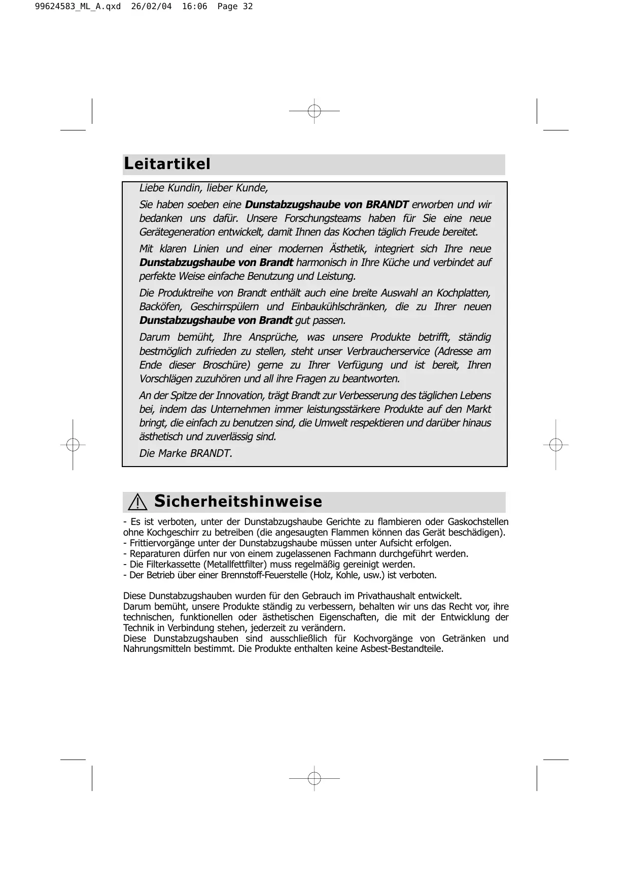 99624583_ML_A.qxd 26/02/04 16:06 Page 32 L eitartikel Liebe Kundin, lieber Kunde, Sie haben soeben eine Dunstabzugshaube von BRANDT erworben und wir bedanken uns dafür. Unsere Forschungsteams haben für Sie eine neue Gerätegeneration entwickelt, damit Ihnen das Kochen täglich Freude bereitet. Mit klaren Linien und einer modernen Ästhetik, integriert sich Ihre neue Dunstabzugshaube von Brandt harmonisch in Ihre Küche und verbindet auf perfekte Weise einfache Benutzung und Leistung. Die Produktreihe von Brandt enthält auch eine breite Auswahl an Kochplatten, Backöfen, Geschirrspülern und Einbaukühlschränken, die zu Ihrer neuen Dunstabzugshaube von Brandt gut passen. Darum bemüht, Ihre Ansprüche, was unsere Produkte betrifft, ständig bestmöglich zufrieden zu stellen, steht unser Verbraucherservice (Adresse am Ende dieser Broschüre) gerne zu Ihrer Verfügung und ist bereit, Ihren Vorschlägen zuzuhören und all ihre Fragen zu beantworten. An der Spitze der Innovation, trägt Brandt zur Verbesserung des täglichen Lebens bei, indem das Unternehmen immer leistungsstärkere Produkte auf den Markt bringt, die einfach zu benutzen sind, die Umwelt respektieren und darüber hinaus ästhetisch und zuverlässig sind. Die Marke BRANDT. S icherheitshinweise - Es ist verboten, unter der Dunstabzugshaube Gerichte zu flambieren oder Gaskochstellen ohne Kochgeschirr zu betreiben (die angesaugten Flammen können das Gerät beschädigen). - Frittiervorgänge unter der Dunstabzugshaube müssen unter Aufsicht erfolgen. - Reparaturen dürfen nur von einem zugelassenen Fachmann durchgeführt werden. - Die Filterkassette (Metallfettfilter) muss regelmäßig gereinigt werden. - Der Betrieb über einer Brennstoff-Feuerstelle (Holz, Kohle, usw.) ist verboten. Diese Dunstabzugshauben wurden für den Gebrauch im Privathaushalt entwickelt. Darum bemüht, unsere Produkte ständig zu verbessern, behalten wir uns das Recht vor, ihre technischen, funktionellen oder ästhetischen Eigenschaften, die mit der Entwicklung der Technik in Verbindung stehen, jederzeit zu verändern. Diese Dunstabzugshauben sind ausschließlich für Kochvorgänge von Getränken und Nahrungsmitteln bestimmt. Die Produkte enthalten keine Asbest-Bestandteile. 99624583_ML_A.qxd 26/02/04 16:06 Page 33 In der Gebrauchsanleitung kennzeichnet, die Sicherheitshinweise, Kennzeichnet Hinweise und kleine Kniffe P räsentierung Ihrer Dunstabzugshaube Abb. 1 Modell mit 3 Geschwindigkeitsstufen