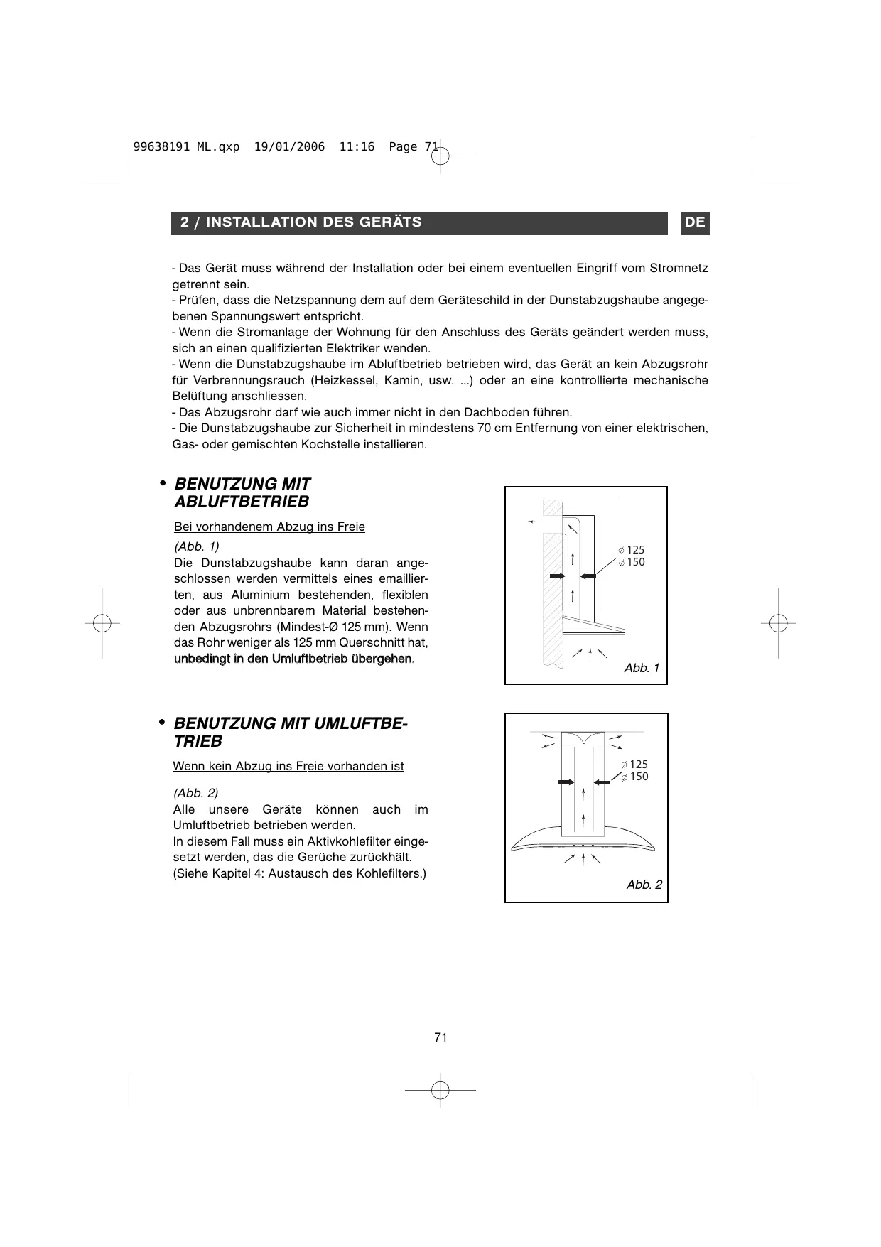 2 / INSTALLATION DES GERÄTS • Benutzung mit Abluftbetrieb _________________________________ • Benutzung mit Umluftbetrieb _________________________________ • Stromanschluss ___________________________________________ • Montage der Dunstabzugshaube _____________________________ • Montage des Kamins º Abluft ins Freie ______________________________________ º Umluft _____________________________________________