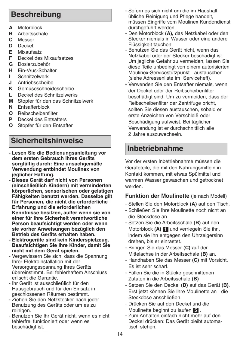 - Sofern es sich nicht um die im Haushalt übliche Reinigung und Pflege handelt, müssen Eingriffe vom Moulinex Kundendienst durchgeführt werden. - Den Motorblock (A), das Netzkabel oder den Stecker niemals in Wasser oder eine andere Flüssigkeit tauchen. - Benutzen Sie das Gerät nicht, wenn das Netzkabel oder der Stecker beschädigt ist. Um jegliche Gefahr zu vermeiden, lassen Sie diese Teile unbedingt von einem autorisierten Moulinex-Servicestützpunkt austauschen (siehe Adressenliste im Serviceheft). - Verwenden Sie den Entsafter niemals, wenn der Deckel oder der Reibscheibenfilter beschädigt sind. Um zu vermeiden, dass der Reibscheibenfilter der Zentrifuge bricht, sollten Sie diesen austauschen, sobald er erste Anzeichen von Verschleiß oder Beschädigung aufweist. Bei täglicher Verwendung ist er durchschnittlich alle 2 Jahre auszuwechseln.