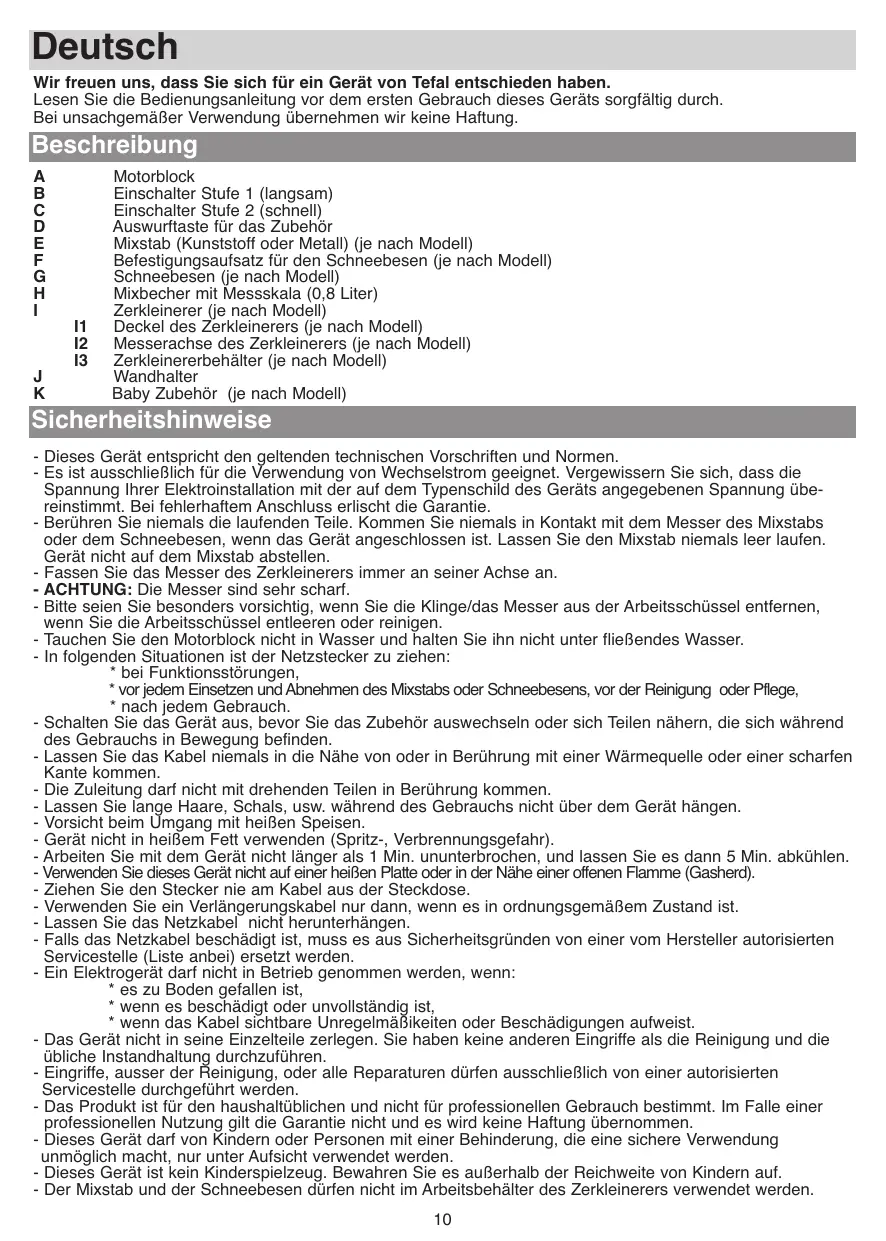 Motorblock Einschalter Stufe 1 (langsam) Einschalter Stufe 2 (schnell) Auswurftaste für das Zubehör Mixstab (Kunststoff oder Metall) (je nach Modell) Befestigungsaufsatz für den Schneebesen (je nach Modell) Schneebesen (je nach Modell) Mixbecher mit Messskala (0,8 Liter) Zerkleinerer (je nach Modell) Deckel des Zerkleinerers (je nach Modell) Messerachse des Zerkleinerers (je nach Modell) Zerkleinererbehälter (je nach Modell) Wandhalter Baby Zubehör (je nach Modell) Sicherheitshinweise - Dieses Gerät entspricht den geltenden technischen Vorschriften und Normen. - Es ist ausschließlich für die Verwendung von Wechselstrom geeignet. Vergewissern Sie sich, dass die Spannung Ihrer Elektroinstallation mit der auf dem Typenschild des Geräts angegebenen Spannung übereinstimmt. Bei fehlerhaftem Anschluss erlischt die Garantie. - Berühren Sie niemals die laufenden Teile. Kommen Sie niemals in Kontakt mit dem Messer des Mixstabs oder dem Schneebesen, wenn das Gerät angeschlossen ist. Lassen Sie den Mixstab niemals leer laufen. Gerät nicht auf dem Mixstab abstellen. - Fassen Sie das Messer des Zerkleinerers immer an seiner Achse an. - ACHTUNG: Die Messer sind sehr scharf. - Bitte seien Sie besonders vorsichtig, wenn Sie die Klinge/das Messer aus der Arbeitsschüssel entfernen, wenn Sie die Arbeitsschüssel entleeren oder reinigen. - Tauchen Sie den Motorblock nicht in Wasser und halten Sie ihn nicht unter fließendes Wasser. - In folgenden Situationen ist der Netzstecker zu ziehen: