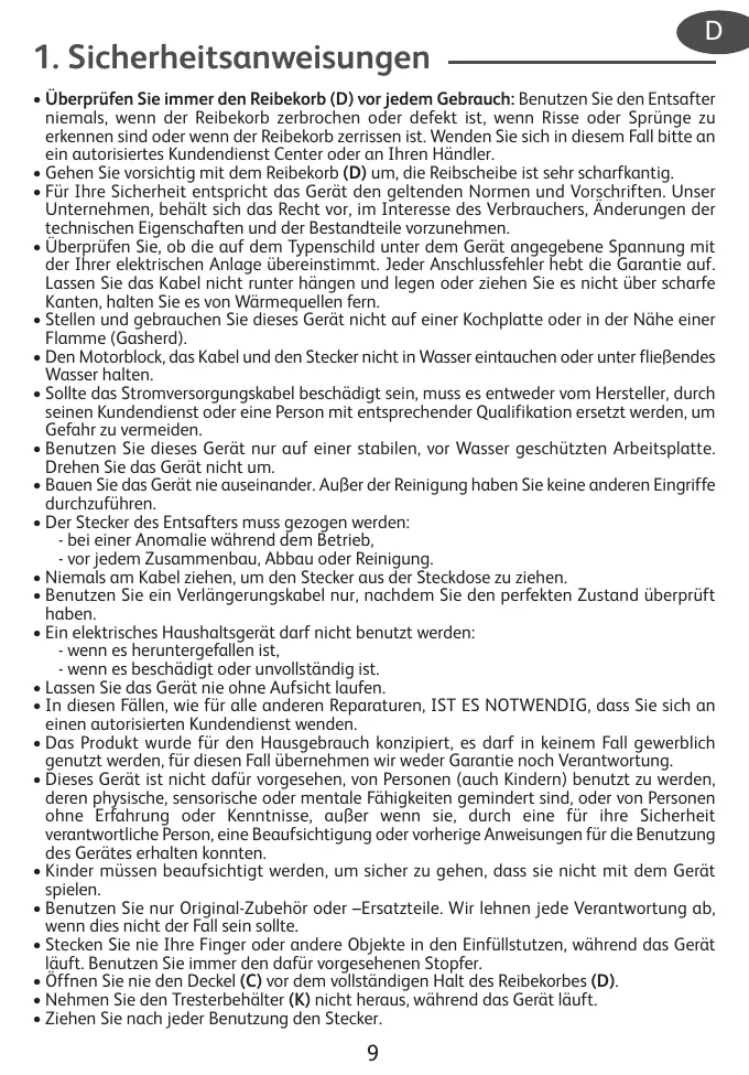 • Überprüfen Sie immer den Reibekorb (D) vor jedem Gebrauch: Benutzen Sie den Entsafter niemals, wenn der Reibekorb zerbrochen oder defekt ist, wenn Risse oder Sprünge zu erkennen sind oder wenn der Reibekorb zerrissen ist. Wenden Sie sich in diesem Fall bitte an ein autorisiertes Kundendienst Center oder an Ihren Händler. • Gehen Sie vorsichtig mit dem Reibekorb (D) um, die Reibscheibe ist sehr scharfkantig. • Für Ihre Sicherheit entspricht das Gerät den geltenden Normen und Vorschriften. Unser Unternehmen, behält sich das Recht vor, im Interesse des Verbrauchers, Änderungen der technischen Eigenschaften und der Bestandteile vorzunehmen. • Überprüfen Sie, ob die auf dem Typenschild unter dem Gerät angegebene Spannung mit der Ihrer elektrischen Anlage übereinstimmt. Jeder Anschlussfehler hebt die Garantie auf. Lassen Sie das Kabel nicht runter hängen und legen oder ziehen Sie es nicht über scharfe Kanten, halten Sie es von Wärmequellen fern. • Stellen und gebrauchen Sie dieses Gerät nicht auf einer Kochplatte oder in der Nähe einer Flamme (Gasherd). • Den Motorblock, das Kabel und den Stecker nicht in Wasser eintauchen oder unter fließendes Wasser halten. • Sollte das Stromversorgungskabel beschädigt sein, muss es entweder vom Hersteller, durch seinen Kundendienst oder eine Person mit entsprechender Qualifikation ersetzt werden, um Gefahr zu vermeiden. • Benutzen Sie dieses Gerät nur auf einer stabilen, vor Wasser geschützten Arbeitsplatte. Drehen Sie das Gerät nicht um. • Bauen Sie das Gerät nie auseinander. Außer der Reinigung haben Sie keine anderen Eingriffe durchzuführen. • Der Stecker des Entsafters muss gezogen werden: - bei einer Anomalie während dem Betrieb, - vor jedem Zusammenbau, Abbau oder Reinigung. • Niemals am Kabel ziehen, um den Stecker aus der Steckdose zu ziehen. • Benutzen Sie ein Verlängerungskabel nur, nachdem Sie den perfekten Zustand überprüft haben. • Ein elektrisches Haushaltsgerät darf nicht benutzt werden: - wenn es heruntergefallen ist, - wenn es beschädigt oder unvollständig ist. • Lassen Sie das Gerät nie ohne Aufsicht laufen. • In diesen Fällen, wie für alle anderen Reparaturen, IST ES NOTWENDIG, dass Sie sich an einen autorisierten Kundendienst wenden. • Das Produkt wurde für den Hausgebrauch konzipiert, es darf in keinem Fall gewerblich genutzt werden, für diesen Fall übernehmen wir weder Garantie noch Verantwortung. • Dieses Gerät ist nicht dafür vorgesehen, von Personen (auch Kindern) benutzt zu werden, deren physische, sensorische oder mentale Fähigkeiten gemindert sind, oder von Personen ohne Erfahrung oder Kenntnisse, außer wenn sie, durch eine für ihre Sicherheit verantwortliche Person, eine Beaufsichtigung oder vorherige Anweisungen für die Benutzung des Gerätes erhalten konnten. • Kinder müssen beaufsichtigt werden, um sicher zu gehen, dass sie nicht mit dem Gerät spielen. • Benutzen Sie nur Original-Zubehör oder –Ersatzteile. Wir lehnen jede Verantwortung ab, wenn dies nicht der Fall sein sollte. • Stecken Sie nie Ihre Finger oder andere Objekte in den Einfüllstutzen, während das Gerät läuft. Benutzen Sie immer den dafür vorgesehenen Stopfer. • Öffnen Sie nie den Deckel (C) vor dem vollständigen Halt des Reibekorbes (D). • Nehmen Sie den Tresterbehälter (K) nicht heraus, während das Gerät läuft. • Ziehen Sie nach jeder Benutzung den Stecker.