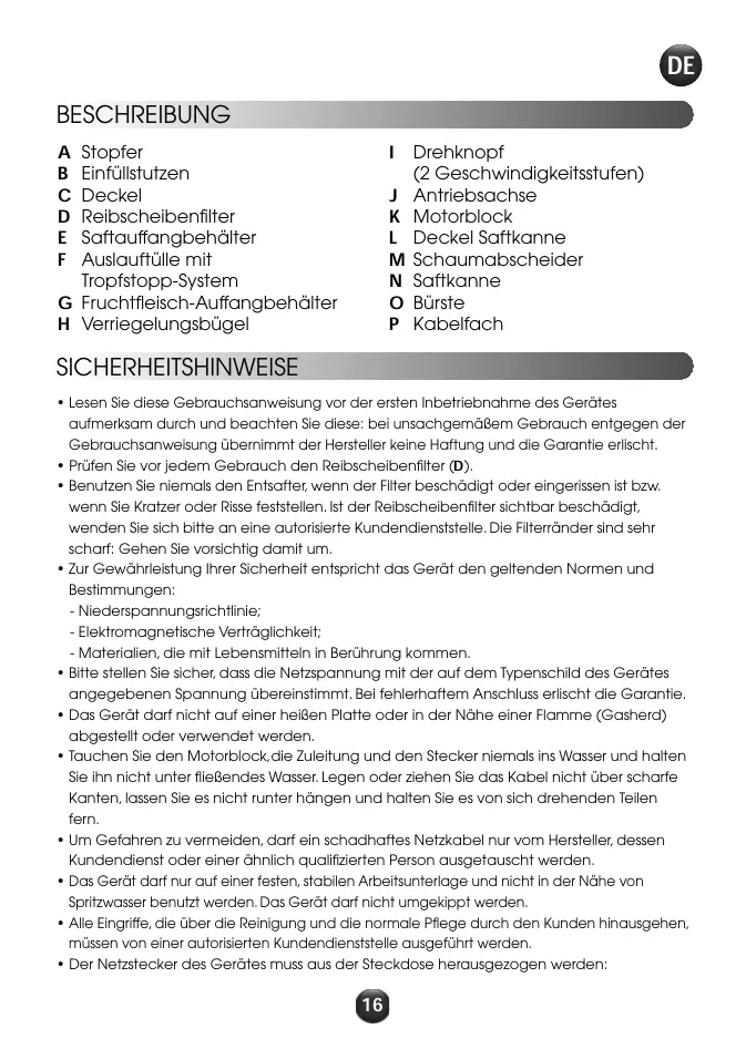 Drehknopf (2 Geschwindigkeitsstufen) Antriebsachse Motorblock Deckel Saftkanne Schaumabscheider Saftkanne Bürste Kabelfach SICHERHEITSHINWEISE