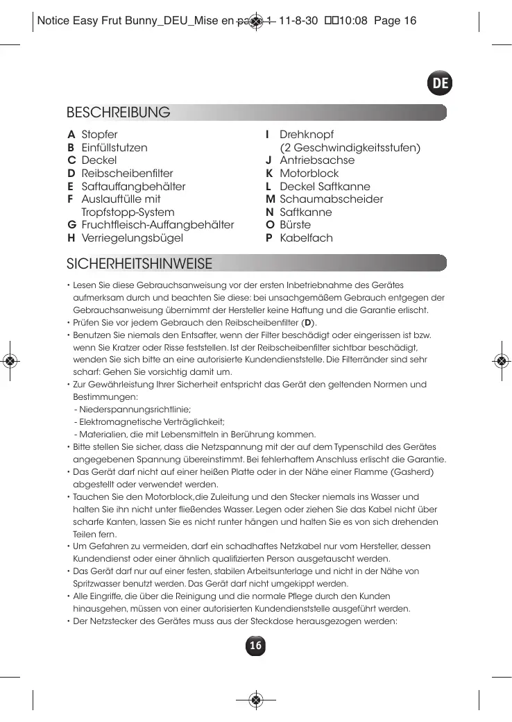 Notice Easy Frut Bunny_DEU_Mise en page 1 11-8-30 10:08 Page 17 - im Falle eines Problems oder einer Störung während des Betriebs; - vor dem Zusammenbau, dem Zerlegen und der Reinigung.