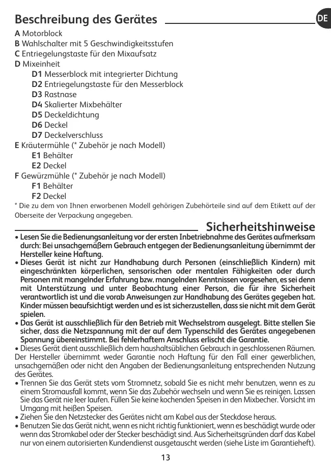 - Directives Basse Tension • Toute intervention, autre que le nettoyage et l'entretien usuel par le client, doit être effectuée par un centre service agréé. • Pour votre sécurité, n'utilisez que des accessoires et des pièces de rechange fournis par les centres service agréés. Attention : aucun accessoire ne pourra vous être vendu sans présentation de votre notice d’utilisation ou de votre appareil. • Ne mettez pas l'appareil, le câble d'alimentation ou la fiche dans du liquide. • Ne laissez pas le câble d'alimentation pendre à portée de mains des enfants, être à proximité ou en contact avec les parties chaudes de l'appareil, près d'une source de chaleur ou sur un angle vif. • Ne passez pas les accessoires contenant du métal au micro-ondes. • Des précautions doivent être prises lors de la manipulation des couteaux affutés du bloc lames (D1), du moulin à fines herbes (E), du moulin à épices (F), lorsqu'on vide les bols et lors du nettoyage : ils sont extrêmement coupants. • Ne touchez jamais les pièces en mouvement lorsque l'appareil est en fonctionnement, attendez l'arrêt complet de l'appareil et des accessoires pour intervenir ou pour enlever ces accessoires. • N'introduisez jamais d'ustensiles de cuisine (cuillère, spatule...) dans le bol (D) pendant le fonctionnement. • Ne laissez pas pendre les cheveux longs, écharpes, cravates etc.… au dessus de l'appareil ou des accessoires en fonctionnement. • Ne faites pas fonctionner le bol blender sans ingrédient, avec des produits secs uniquement ou durs (tels que des morceaux de sucre...), avec du liquide bouillant (supérieur à 80°C/176°F) ou si le couvercle (D6) équipé du joint (D5) n'est pas en place sur le bol (D). • Ne faites pas fonctionner votre appareil sans surveillance. • Versez toujours les ingrédients liquides en premier dans le bol blender avant d'ajouter les ingrédients solides, sans dépasser le niveau maximal. • Ne pas utiliser les bols comme récipients (congélation, cuisson, stérilisation). • N'utilisez pas votre appareil plus de 3 minutes en marche continue. • Placez l'appareil sur un plan de travail stable, résistant à la chaleur, propre et sec. • N'utilisez jamais cet appareil pour mélanger ou mixer des ingrédients non alimentaires.