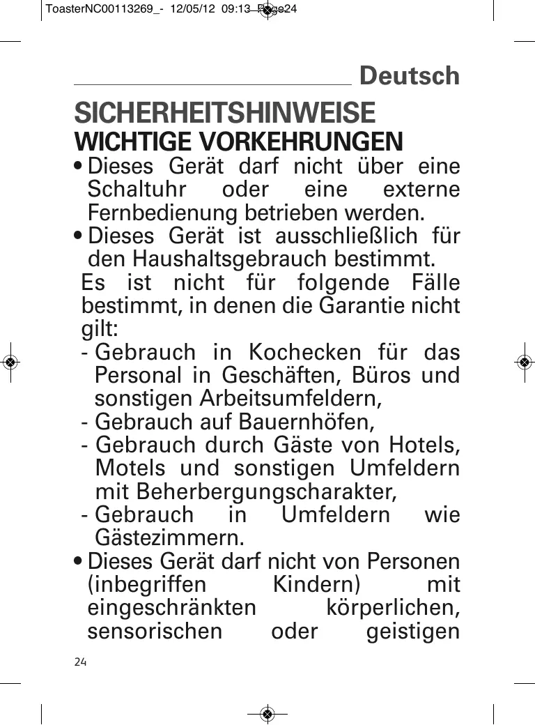 ToasterNC00113269_- 12/05/12 09:13 Page24 Deutsch SICHERHEITSHINWEISE WICHTIGE VORKEHRUNGEN