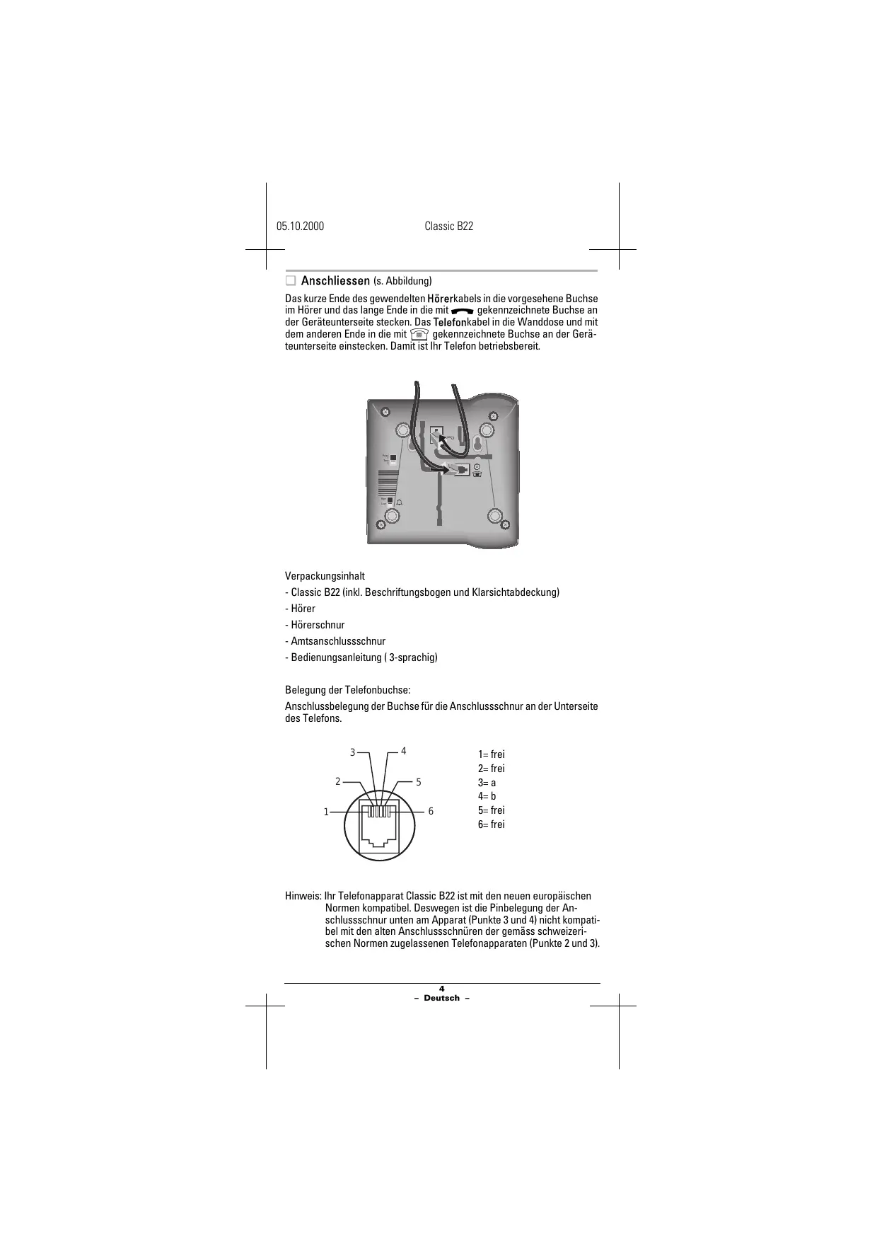 1= frei 2= frei 3= a 4= b 5= frei 6= frei Hinweis: Ihr Telefonapparat Classic B22 ist mit den neuen europäischen Normen kompatibel. Deswegen ist die Pinbelegung der Anschlussschnur unten am Apparat (Punkte 3 und 4) nicht kompatibel mit den alten Anschlussschnüren der gemäss schweizerischen Normen zugelassenen Telefonapparaten (Punkte 2 und 3).