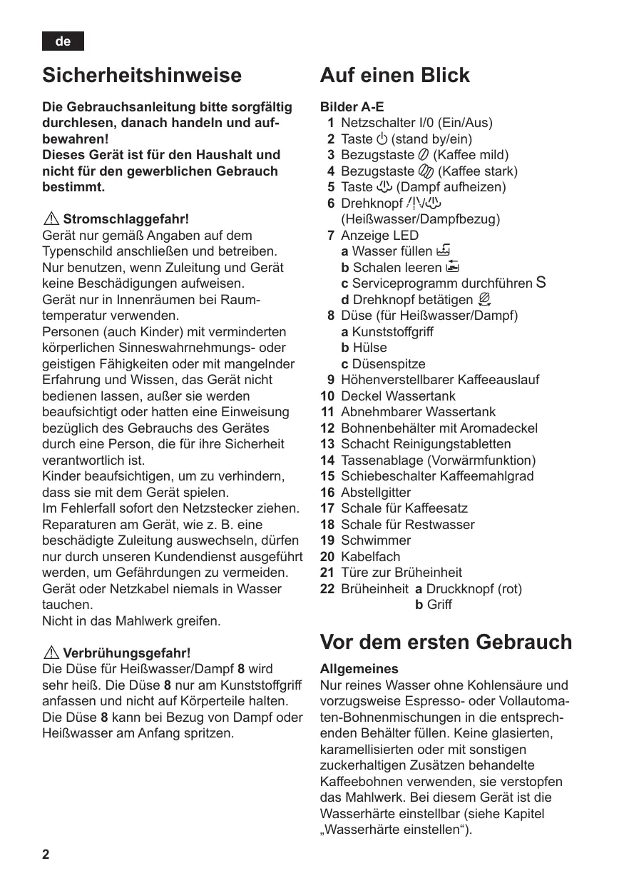 Sicherheitshinweise Auf einen Blick Die Gebrauchsanleitung bitte sorgfältig durchlesen, danach handeln und auf bewahren! Dieses Gerät ist für den Haushalt und nicht für den gewerblichen Gebrauch bestimmt. Bilder A-E 1 Netzschalter I/0 (Ein/Aus) 2 Taste a (stand by/ein) 3 Bezugstaste 5 (Kaffee mild) 4 Bezugstaste K (Kaffee stark) 5 Taste h (Dampf aufheizen) 6 Drehknopf g/h (Heißwasser/Dampfbezug) 7 Anzeige LED a Wasser füllen H b Schalen leeren I c Serviceprogramm durchführen S d Drehknopf betätigen J 8 Düse (für Heißwasser/Dampf) a Kunststoffgriff b Hülse c Düsenspitze 9 Höhenverstellbarer Kaffeeauslauf 10 Deckel Wassertank 11 Abnehmbarer Wassertank 12 Bohnenbehälter mit Aromadeckel 13 Schacht Reinigungstabletten 14 Tassenablage (Vorwärmfunktion) 15 Schiebeschalter Kaffeemahlgrad 16 Abstellgitter 17 Schale für Kaffeesatz 18 Schale für Restwasser 19 Schwimmer 20 Kabelfach 21 Türe zur Brüheinheit 22 Brüheinheit a Druckknopf (rot) b Griff ! Stromschlaggefahr!