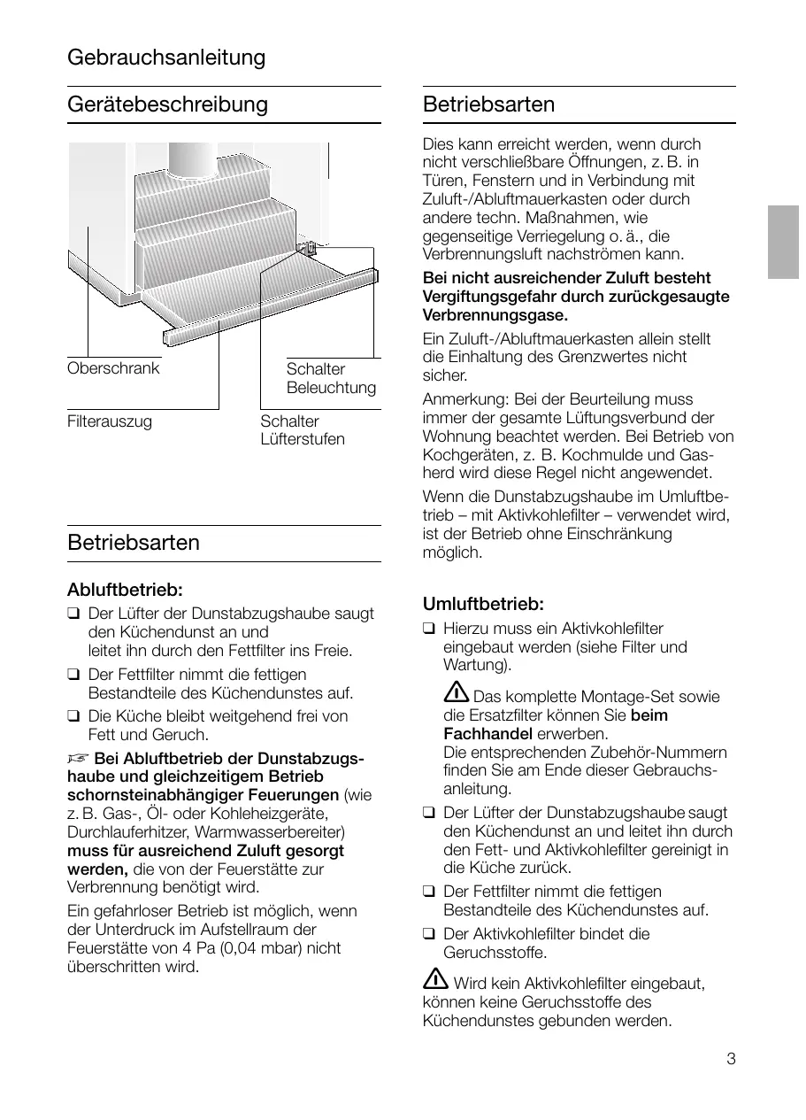 min. 430 Gebrauchsanleitung Gerätebeschreibung Oberschrank Filterauszug Betriebsarten Schalter Beleuchtung Schalter Lüfterstufen Betriebsarten Abluftbetrieb: ❑ Der Lüfter der Dunstabzugshaube saugt den Küchendunst an und leitet ihn durch den Fettfilter ins Freie. ❑ Der Fettfilter nimmt die fettigen Bestandteile des Küchendunstes auf. ❑ Die Küche bleibt weitgehend frei von Fett und Geruch. D Bei Abluftbetrieb der Dunstabzugshaube und gleichzeitigem Betrieb schornsteinabhängiger Feuerungen (wie z. B. Gas-, Öl- oder Kohleheizgeräte, Durchlauferhitzer, Warmwasserbereiter) muss für ausreichend Zuluft gesorgt werden, die von der Feuerstätte zur Verbrennung benötigt wird. Ein gefahrloser Betrieb ist möglich, wenn der Unterdruck im Aufstellraum der Feuerstätte von 4 Pa (0,04 mbar) nicht überschritten wird. Dies kann erreicht werden, wenn durch nicht verschließbare Öffnungen, z. B. in Türen, Fenstern und in Verbindung mit Zuluft-/Abluftmauerkasten oder durch andere techn. Maßnahmen, wie gegenseitige Verriegelung o. ä., die Verbrennungsluft nachströmen kann. Bei nicht ausreichender Zuluft besteht Vergiftungsgefahr durch zurückgesaugte Verbrennungsgase. Ein Zuluft-/Abluftmauerkasten allein stellt die Einhaltung des Grenzwertes nicht sicher. Anmerkung: Bei der Beurteilung muss immer der gesamte Lüftungsverbund der Wohnung beachtet werden. Bei Betrieb von Kochgeräten, z. B. Kochmulde und Gasherd wird diese Regel nicht angewendet. Wenn die Dunstabzugshaube im Umluftbetrieb – mit Aktivkohlefilter – verwendet wird, ist der Betrieb ohne Einschränkung möglich. Umluftbetrieb: ❑ Hierzu muss ein Aktivkohlefilter eingebaut werden (siehe Filter und Wartung). 몇 Das komplette Montage-Set sowie die Ersatzfilter können Sie beim Fachhandel erwerben. Die entsprechenden Zubehör-Nummern finden Sie am Ende dieser Gebrauchsanleitung. ❑ Der Lüfter der Dunstabzugshaube saugt den Küchendunst an und leitet ihn durch den Fett- und Aktivkohlefilter gereinigt in die Küche zurück. ❑ Der Fettfilter nimmt die fettigen Bestandteile des Küchendunstes auf. ❑ Der Aktivkohlefilter bindet die Geruchsstoffe.