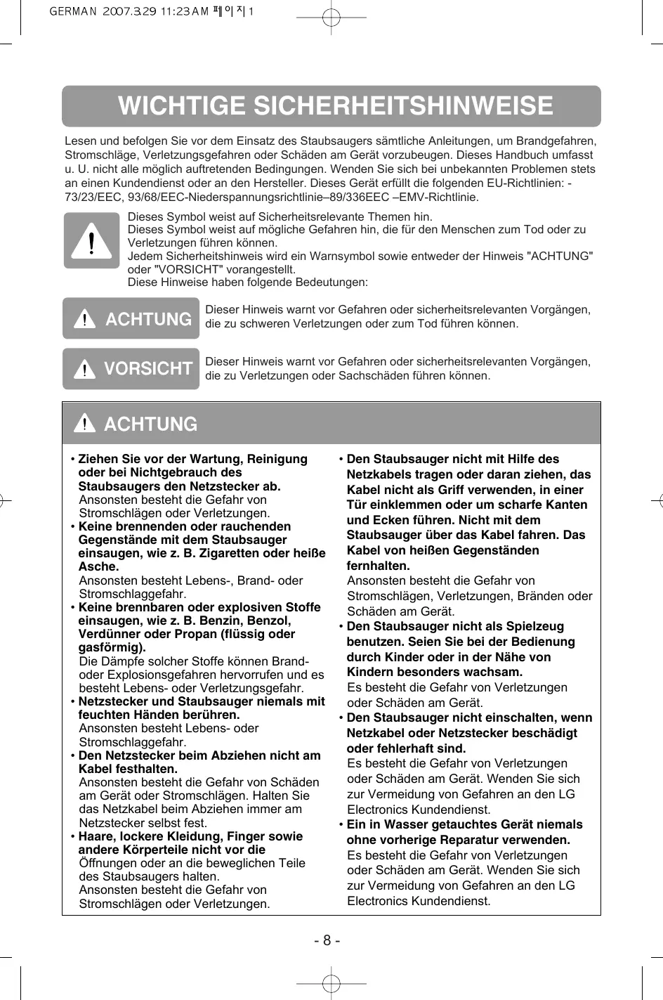WICHTIGE SICHERHEITSHINWEISE Lesen und befolgen Sie vor dem Einsatz des Staubsaugers sämtliche Anleitungen, um Brandgefahren, Stromschläge, Verletzungsgefahren oder Schäden am Gerät vorzubeugen. Dieses Handbuch umfasst u. U. nicht alle möglich auftretenden Bedingungen. Wenden Sie sich bei unbekannten Problemen stets an einen Kundendienst oder an den Hersteller. Dieses Gerät erfüllt die folgenden EU-Richtlinien: 73/23/EEC, 93/68/EEC-Niederspannungsrichtlinie–89/336EEC –EMV-Richtlinie. Dieses Symbol weist auf Sicherheitsrelevante Themen hin. Dieses Symbol weist auf mögliche Gefahren hin, die für den Menschen zum Tod oder zu Verletzungen führen können. Jedem Sicherheitshinweis wird ein Warnsymbol sowie entweder der Hinweis "ACHTUNG" oder "VORSICHT" vorangestellt. Diese Hinweise haben folgende Bedeutungen: ACHTUNG Dieser Hinweis warnt vor Gefahren oder sicherheitsrelevanten Vorgängen, die zu schweren Verletzungen oder zum Tod führen können. VORSICHT Dieser Hinweis warnt vor Gefahren oder sicherheitsrelevanten Vorgängen, die zu Verletzungen oder Sachschäden führen können. ACHTUNG