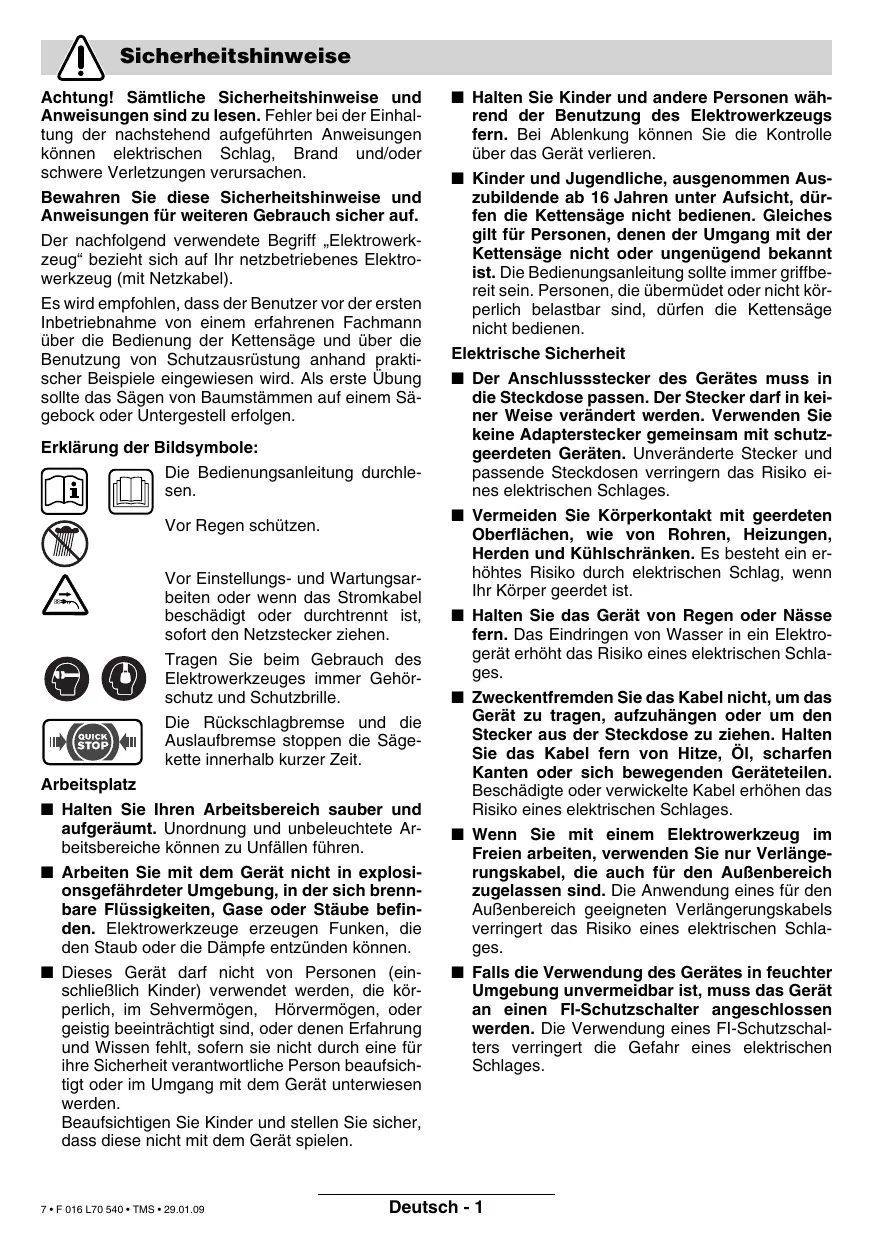 Lieferumfang Alle Teile des Gerätes sind vorsichtig aus der Verpackung zu entnehmen und auf Vollständigkeit zu überprüfen: – Kettensäge – Abdeckung – Sägekette – Schwert – Kettenschutz – Bedienungsanleitung Wenn Teile fehlen oder beschädigt sind, wenden Sie sich bitte an Ihren Händler. 10 • F 016 L70 540 • TMS • 29.01.09