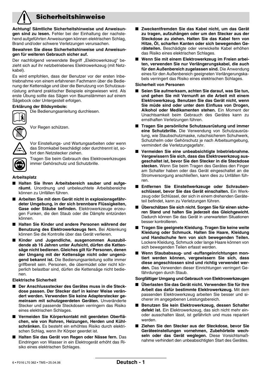 Lors de l’utilisation de l’outil électroportatif, portez toujours une protection acoustique et des lunettes de protection. Endroit de travail ■ Maintenez l’endroit de travail propre et bien rangé. Un lieu de travail en désordre ou mal éclairé augmente le risque d’accidents. ■ N’utilisez pas l’appareil dans un environnement présentant des risques d’explosion et où se trouvent des liquides, des gaz ou poussières inflammables. Les outils électroportatifs génèrent des étincelles risquant d’enflammer les poussières ou les vapeurs. ■ Tenez les enfants et autres personnes éloignés durant l’utilisation de l’outil électroportatif. En cas d’inattention vous risquez de perdre le contrôle sur l’appareil. ■ Les enfants et les adolescents n’ont pas le droit d’utiliser la tronçonneuse ; sauf les apprentis à partir de 16 ans sous la surveillance d’un adulte. Ceci vaut également pour les personnes ne connaissant pas ou très peu le maniement de la tronçonneuse. Les instructions d’utilisation devraient toujours se trouver à portée de la main. Les personnes fatiguées ou fragiles physiquement, n’ont pas le droit d’utiliser la tronçonneuse. Sécurité relative au système électrique ■ La fiche de secteur de l’outil électroportatif doit être appropriée à la prise de courant. Ne pas modifier en aucun cas la fiche. Ne pas utiliser de fiches d’adaptateur avec des appareils avec mise à la terre. Les fiches non modifiées et les prises de courant appropriées réduisent le risque de choc électrique. ■ Eviter le contact physique avec des surfaces mises à la terre tels que tuyaux, radiateurs, fours et réfrigérateurs. Il y a un risque élevé de choc électrique au cas où votre corps serait relié à la terre. ■ Ne pas exposer l’outil électroportatif à la pluie ou à l’humidité. La pénétration d’eau dans un outil électroportatif augmente le risque d’un choc électrique. 26 • F016 L70 362 • TMS • 25.04.06
