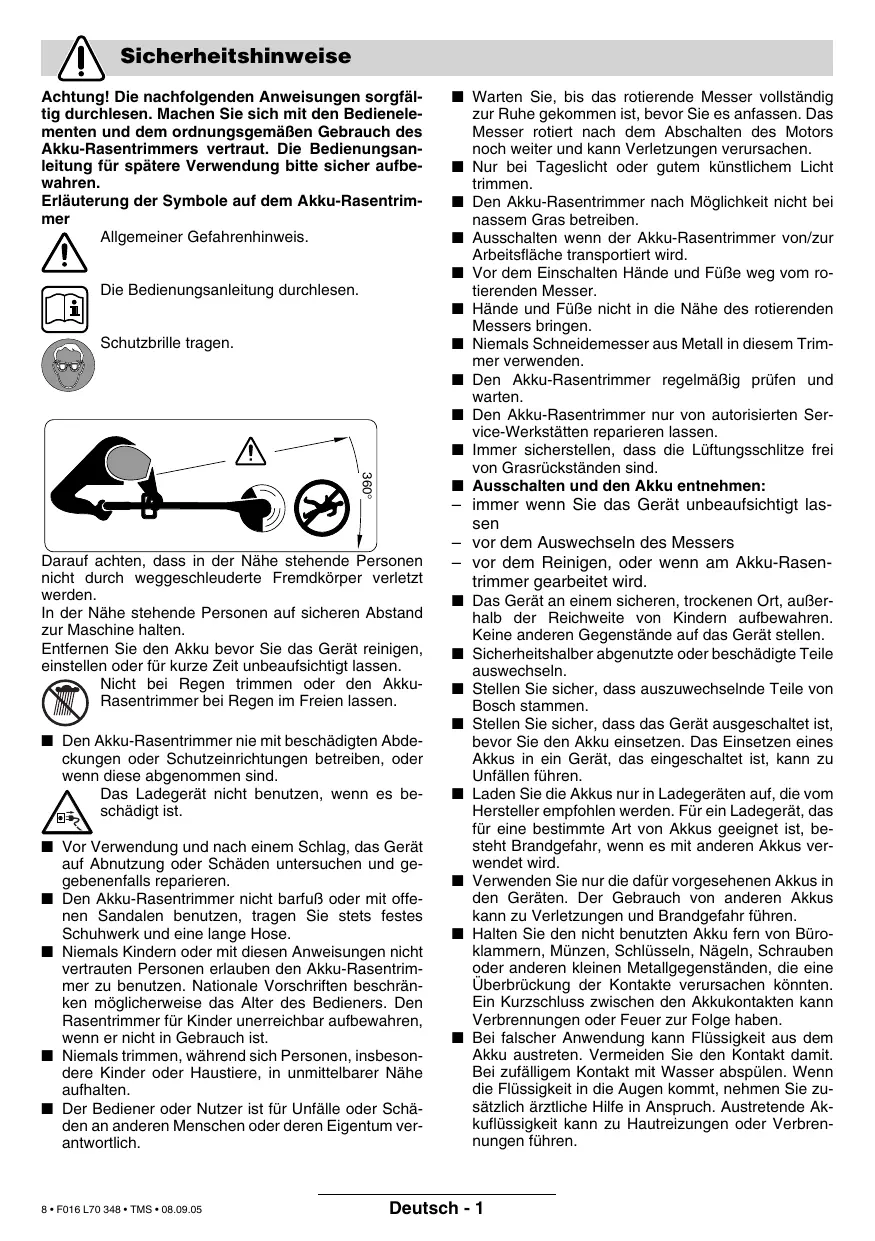 Darauf achten, dass in der Nähe stehende Personen nicht durch weggeschleuderte Fremdkörper verletzt werden. In der Nähe stehende Personen auf sicheren Abstand zur Maschine halten. Entfernen Sie den Akku bevor Sie das Gerät reinigen, einstellen oder für kurze Zeit unbeaufsichtigt lassen. Nicht bei Regen trimmen oder den AkkuRasentrimmer bei Regen im Freien lassen. ■ Den Akku-Rasentrimmer nie mit beschädigten Abdeckungen oder Schutzeinrichtungen betreiben, oder wenn diese abgenommen sind. Das Ladegerät nicht benutzen, wenn es beschädigt ist. ■ Vor Verwendung und nach einem Schlag, das Gerät auf Abnutzung oder Schäden untersuchen und gegebenenfalls reparieren. ■ Den Akku-Rasentrimmer nicht barfuß oder mit offenen Sandalen benutzen, tragen Sie stets festes Schuhwerk und eine lange Hose. ■ Niemals Kindern oder mit diesen Anweisungen nicht vertrauten Personen erlauben den Akku-Rasentrimmer zu benutzen. Nationale Vorschriften beschränken möglicherweise das Alter des Bedieners. Den Rasentrimmer für Kinder unerreichbar aufbewahren, wenn er nicht in Gebrauch ist. ■ Niemals trimmen, während sich Personen, insbesondere Kinder oder Haustiere, in unmittelbarer Nähe aufhalten. ■ Der Bediener oder Nutzer ist für Unfälle oder Schäden an anderen Menschen oder deren Eigentum verantwortlich.