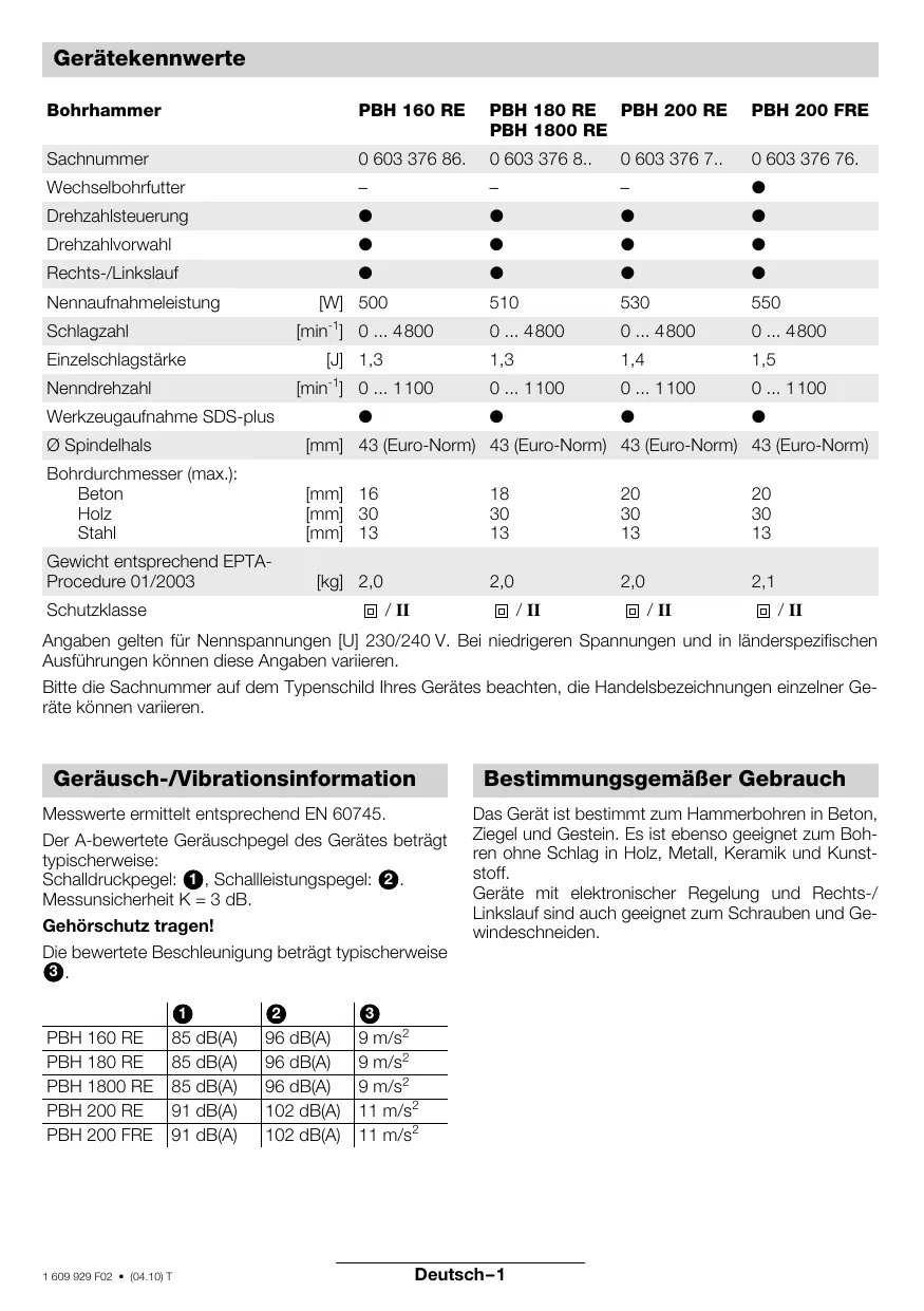Staubschutzkappe auswechseln Beschädigte Staubschutzkappe rechtzeitig auswechseln, da Staub, der in die Werkzeugaufnahme eindringt, zu Funktionsstörungen führt. Es wird empfohlen, dies von einem Kundendienst vornehmen zu lassen. Sollte das Gerät trotz sorgfältiger Herstell- und Prüfverfahren einmal ausfallen, ist die Reparatur von einer autorisierten Kundendienststelle für Bosch-Elektrowerkzeuge ausführen zu lassen. Bei allen Rückfragen und Ersatzteilbestellungen bitte unbedingt die 10-stellige Sachnummer laut Typenschild des Gerätes angeben. Explosionszeichnungen und Informationen zu Ersatzteilen finden Sie unter: www.bosch-pt.com. www.powertool-portal.de, das Internetportal für Heimwerker und Gartenfreunde www.dha.de, das komplette Service-Angebot der Deutschen Heimwerker Akademie Deutschland Robert Bosch GmbH Servicezentrum Elektrowerkzeuge Zur Luhne 2 37589 Kalefeld ✆ Service:. . . . . . . . . . . . . . . . . . . 01 80/3 35 54 99 Fax . . . . . . . . . . . . . . . . . . . + 49 (0) 55 53/20 22 37 ✆ Kundenberater: . . . . . . . . . . . . . 01 80/3 33 57 99 Österreich ABE Service GmbH Jochen-Rindt-Straße 1 1232 Wien ✆ Service:. . . . . . . . . . . . . . . . . . +43 (0)1/61 03 80 Fax . . . . . . . . . . . . . . . . . . . . . +43 (0)1/61 03 84 91 ✆ Kundenberater: . . . . . . . . +43 (0)1/7 97 22 30 66 E-Mail: abe@abe-service.co.at Schweiz ✆ Service:. . . . . . . . . . . . . . . . . +41 (0)1/847 16 16 Fax . . . . . . . . . . . . . . . . . . . . . . +41 (0)1/847 16 57 ✆ Kundenberater . . . . . . . . . . . . . . 0 800 55 11 55 Umweltschutz Konformitätserklärung Wir erklären in alleiniger Verantwortung, dass dieses Produkt mit den folgenden Normen oder normativen Dokumenten übereinstimmt: EN 60745 gemäß den Bestimmungen der Richtlinien 89/336/EWG, 98/37/EG. Rohstoffrückgewinnung statt Müllentsorgung Gerät, Zubehör und Verpackung sollten einer umweltgerechten Wiederverwertung zugeführt werden. Diese Anleitung ist aus chlorfrei gefertigtem RecyclingPapier hergestellt. Zum sortenreinen Recycling sind Kunststoffteile gekennzeichnet. In Deutschland können nicht mehr gebrauchsfähige Geräte zum Recycling beim Handel abgegeben oder (ausreichend frankiert) direkt eingeschickt werden an: Recyclingzentrum Elektrowerkzeuge Osteroder Landstr. 3 37589 Kalefeld 1 609 929 F02 • (04.10) T Dr. Egbert Schneider Senior Vice President Engineering Dr. Eckerhard Strötgen Head of Product Certification Robert Bosch GmbH, Geschäftsbereich Elektrowerkzeuge Änderungen vorbehalten Deutsch–5 Product Specifications Rotary Hammer PBH 160 RE
