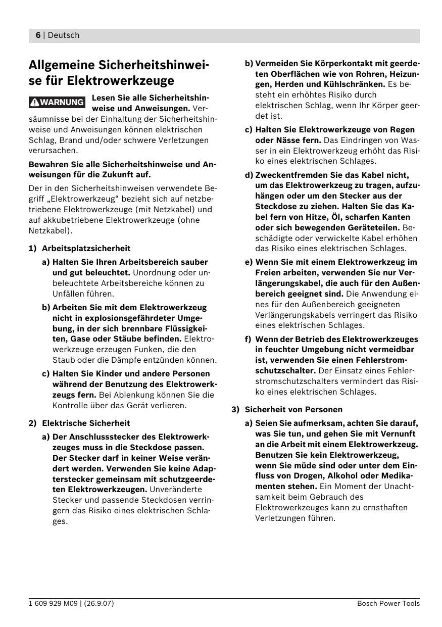 1 609 929 M09 | (26.9.07) 6 | Deutsch Allgemeine Sicherheitshinweise für Elektrowerkzeuge