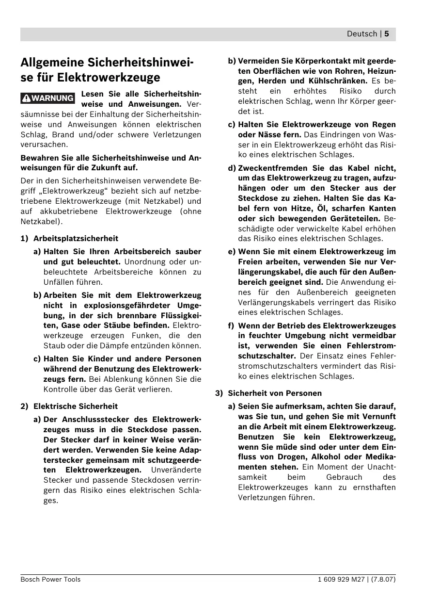 1 609 929 M27 | (7.8.07) Bosch Power Tools Deutsch | 5 Allgemeine Sicherheitshinweise für Elektrowerkzeuge
