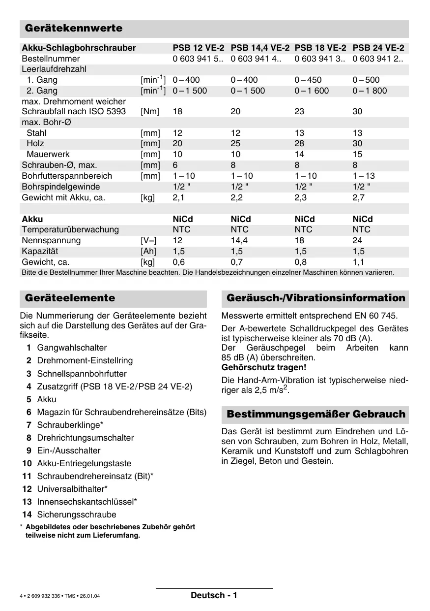 1 – 13 1/2 " 2,7 [V=] [Ah] [kg] NiCd NTC 1,5 0,6 NiCd NTC 14,4 1,5 0,7 NiCd NTC 1,5 0,8 NiCd NTC 1,5 1,1 Bitte die Bestellnummer Ihrer Maschine beachten. Die Handelsbezeichnungen einzelner Maschinen können variieren. Geräteelemente Geräusch-/Vibrationsinformation Die Nummerierung der Geräteelemente bezieht sich auf die Darstellung des Gerätes auf der Grafikseite. 1 Gangwahlschalter 2 Drehmoment-Einstellring 3 Schnellspannbohrfutter 4 Zusatzgriff (PSB 18 VE-2/PSB 24 VE-2) 5 Akku 6 Magazin für Schraubendrehereinsätze (Bits) 7 Schrauberklinge* 8 Drehrichtungsumschalter 9 Ein-/Ausschalter 10 Akku-Entriegelungstaste 11 Schraubendrehereinsatz (Bit)* 12 Universalbithalter* 13 Innensechskantschlüssel* 14 Sicherungsschraube Messwerte ermittelt entsprechend EN 60 745. Der A-bewertete Schalldruckpegel des Gerätes ist typischerweise kleiner als 70 dB (A). Der Geräuschpegel beim Arbeiten kann 85 dB (A) überschreiten. Gehörschutz tragen! Die Hand-Arm-Vibration ist typischerweise niedriger als 2,5 m/s2. Bestimmungsgemäßer Gebrauch Das Gerät ist bestimmt zum Eindrehen und Lösen von Schrauben, zum Bohren in Holz, Metall, Keramik und Kunststoff und zum Schlagbohren in Ziegel, Beton und Gestein.