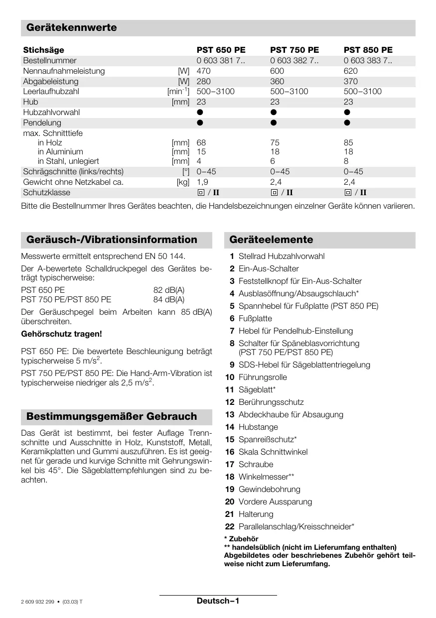 0–45 2,4 / II Bitte die Bestellnummer Ihres Gerätes beachten, die Handelsbezeichnungen einzelner Geräte können variieren. Geräusch-/Vibrationsinformation Messwerte ermittelt entsprechend EN 50 144. Der A-bewertete Schalldruckpegel des Gerätes beträgt typischerweise: PST 650 PE 82 dB(A)