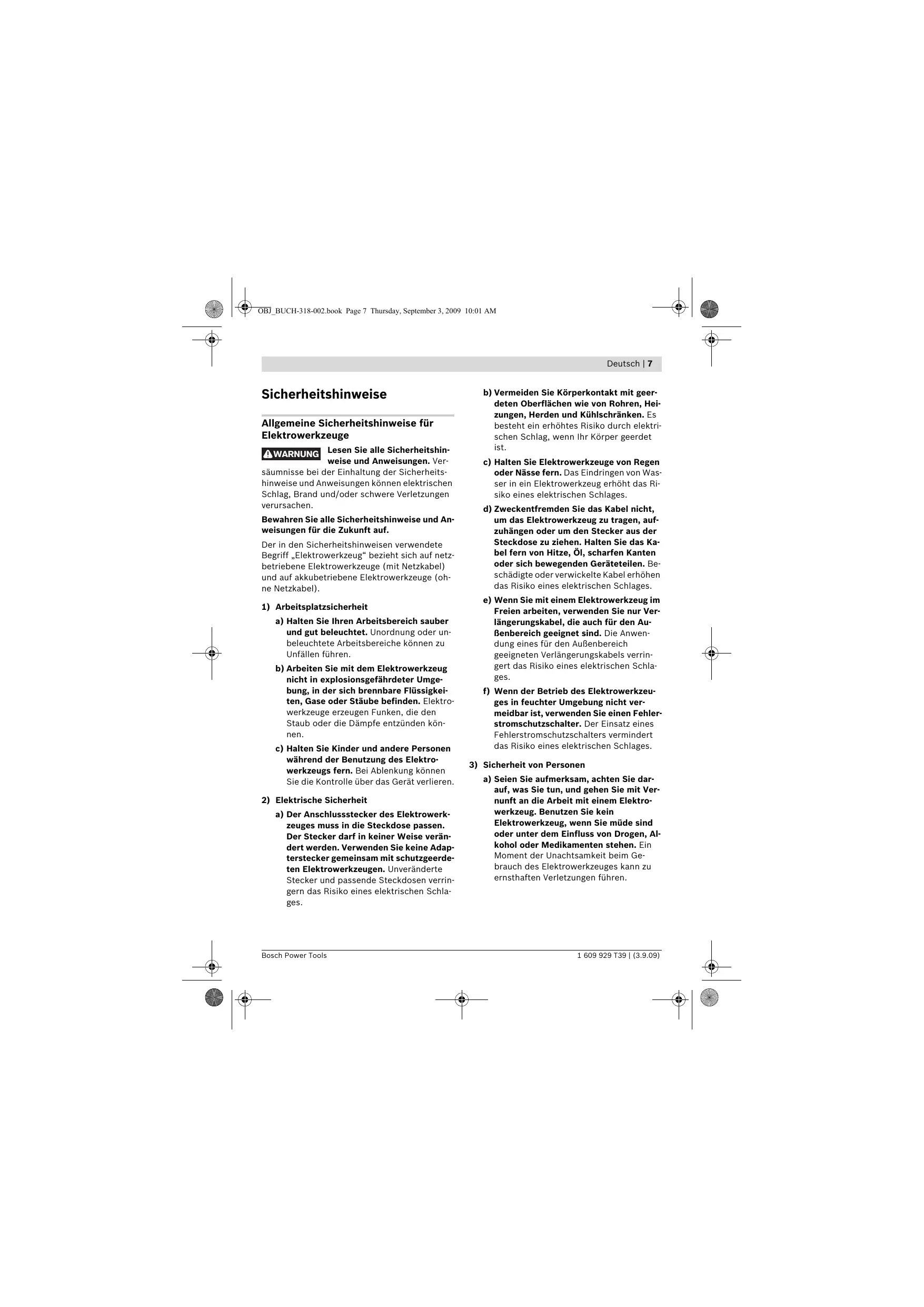 a) Seien Sie aufmerksam, achten Sie darauf, was Sie tun, und gehen Sie mit Vernunft an die Arbeit mit einem Elektrowerkzeug. Benutzen Sie kein Elektrowerkzeug, wenn Sie müde sind oder unter dem Einfluss von Drogen, Alkohol oder Medikamenten stehen. Ein Moment der Unachtsamkeit beim Gebrauch des Elektrowerkzeuges kann zu ernsthaften Verletzungen führen. 1 609 929 T39 | (3.9.09) OBJ_BUCH-318-002.book Page 8 Thursday, September 3, 2009 10:01 AM 8 | Deutsch b) Tragen Sie persönliche Schutzausrüstung und immer eine Schutzbrille. Das Tragen persönlicher Schutzausrüstung, wie Staubmaske, rutschfeste Sicherheitsschuhe, Schutzhelm oder Gehörschutz, je nach Art und Einsatz des Elektrowerkzeuges, verringert das Risiko von Verletzungen. c) Vermeiden Sie eine unbeabsichtigte Inbetriebnahme. Vergewissern Sie sich, dass das Elektrowerkzeug ausgeschaltet ist, bevor Sie es an die Stromversorgung und/oder den Akku anschließen, es aufnehmen oder tragen. Wenn Sie beim Tragen des Elektrowerkzeuges den Finger am Schalter haben oder das Gerät eingeschaltet an die Stromversorgung anschließen, kann dies zu Unfällen führen. d) Entfernen Sie Einstellwerkzeuge oder Schraubenschlüssel, bevor Sie das Elektrowerkzeug einschalten. Ein Werkzeug oder Schlüssel, der sich in einem drehenden Geräteteil befindet, kann zu Verletzungen führen. e) Vermeiden Sie eine abnormale Körperhaltung. Sorgen Sie für einen sicheren Stand und halten Sie jederzeit das Gleichgewicht. Dadurch können Sie das Elektrowerkzeug in unerwarteten Situationen besser kontrollieren. f) Tragen Sie geeignete Kleidung. Tragen Sie keine weite Kleidung oder Schmuck. Halten Sie Haare, Kleidung und Handschuhe fern von sich bewegenden Teilen. Lockere Kleidung, Schmuck oder lange Haare können von sich bewegenden Teilen erfasst werden. g) Wenn Staubabsaug- und -auffangeinrichtungen montiert werden können, vergewissern Sie sich, dass diese angeschlossen sind und richtig verwendet werden. Verwendung einer Staubabsaugung kann Gefährdungen durch Staub verringern. 1 609 929 T39 | (3.9.09)